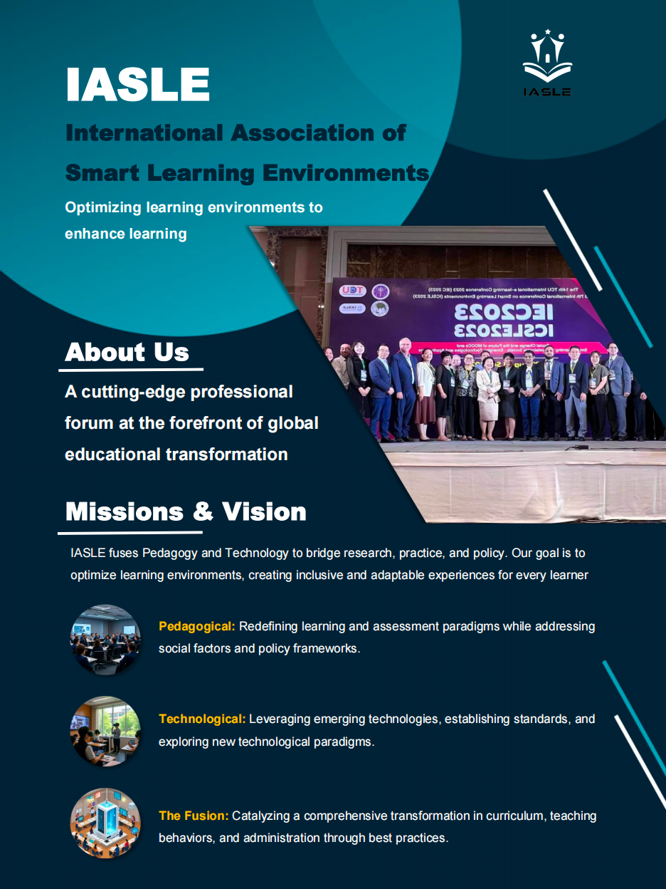 The International Association of Smart Learning Environments (IASLE) stands as a cutting-edge professional forum and community at the forefront of global educational transformation. Functioning as a platform for researchers, academics, practitioners, and industry experts, we are dedicated to engaging in constructive dialogue to address the limitations of existing educational models. Our core mandate is to reform teaching and learning by fusing pedagogy with technology to advance current frameworks into sophisticated "Smart Learning Environments." We are not merely an academic organization, but an engine of change driving the evolution, design, and implementation of future-ready education.
