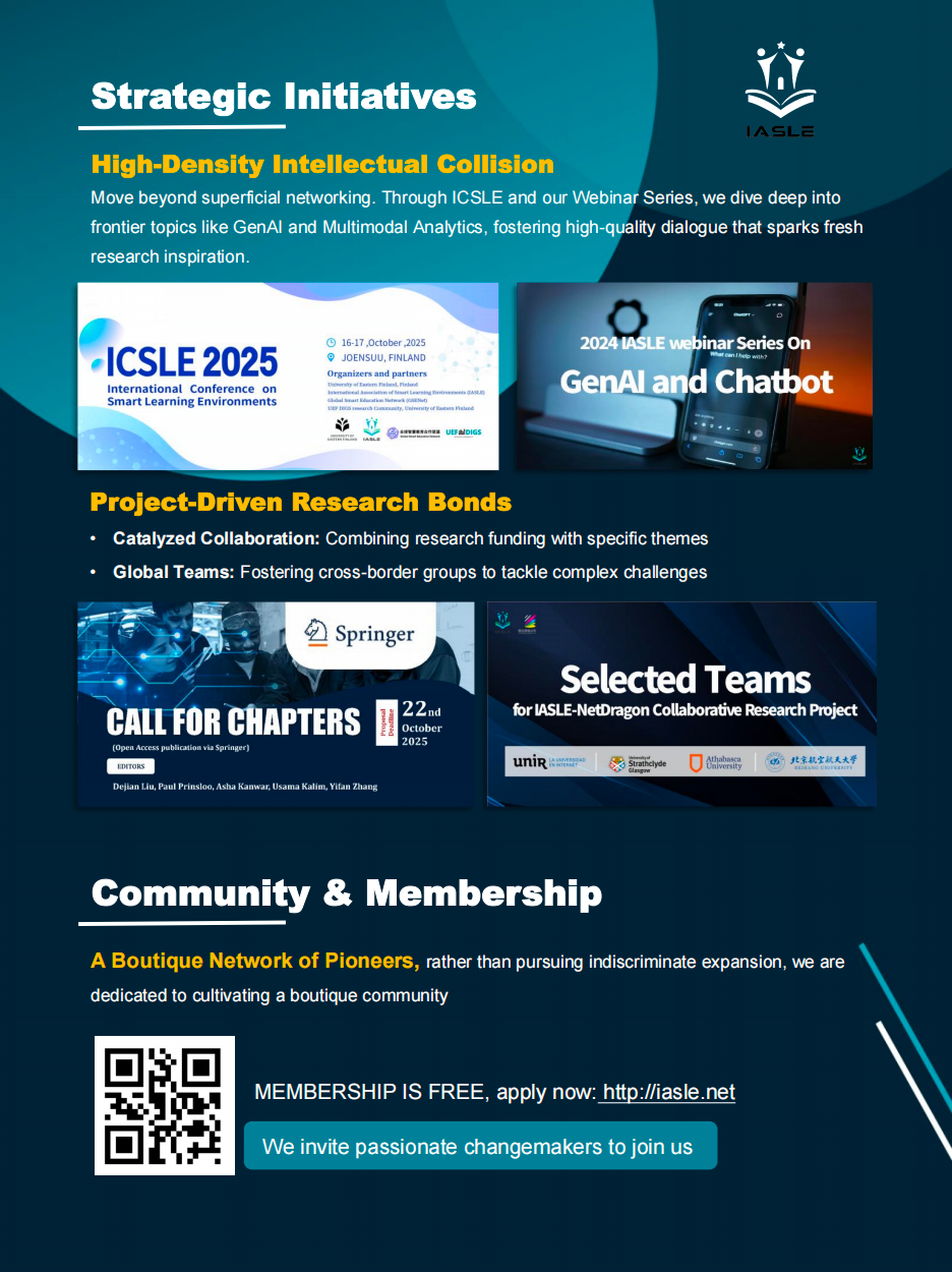 High-Density Intellectual Collision: Through our flagship conference (ICSLE) and Webinar Series, we move beyond superficial networking to focus on frontier topics like Generative AI and Multimodal Analytics. This high-frequency, high-quality dialogue ensures members gain immediate insights into the field's latest developments and spark fresh research inspiration.