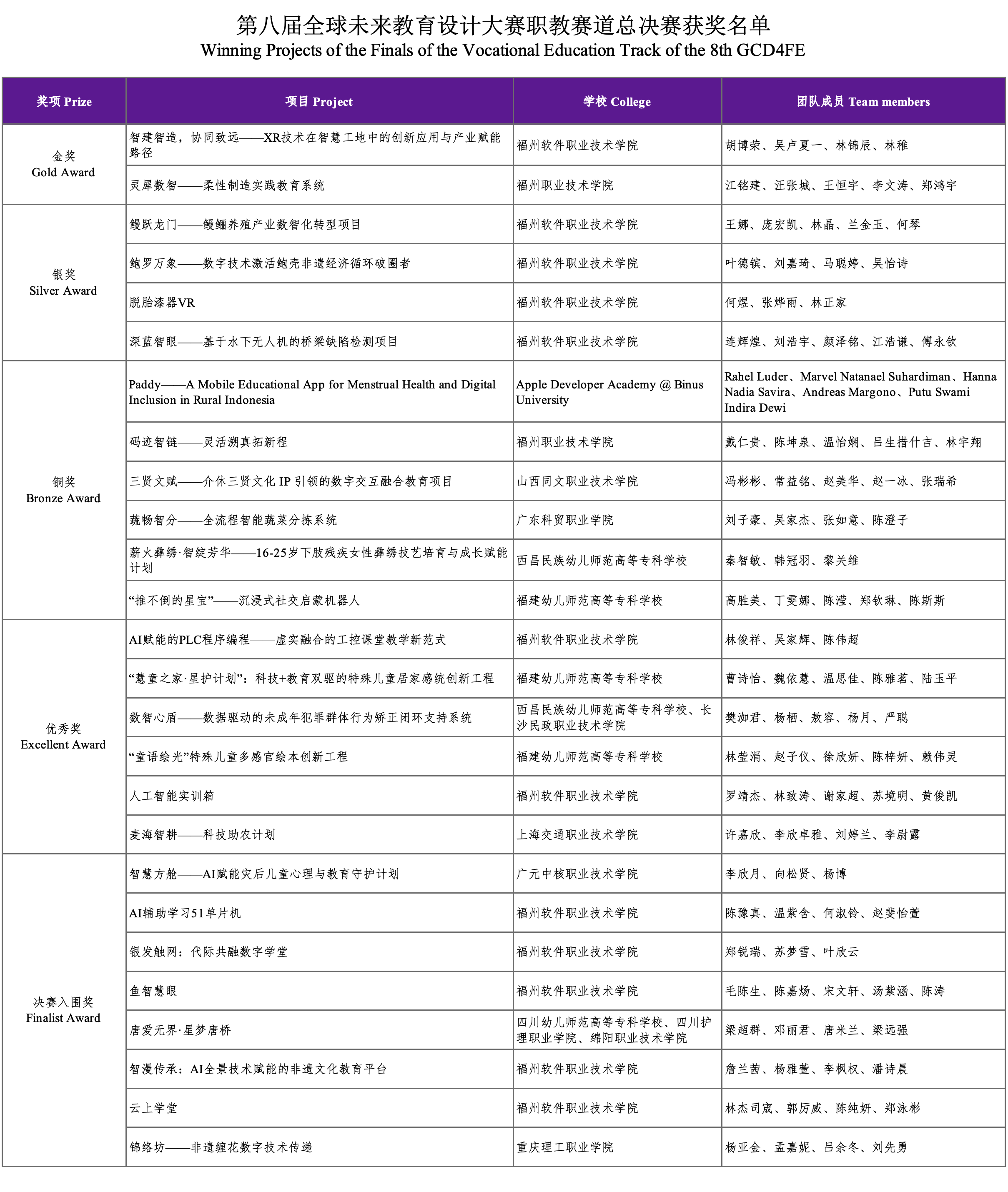 Since its launch, the Global Competition on Design for Future Education has been successfully held for eight consecutive editions and has expanded to more than 40 countries worldwide. For this year’s Vocational Education Track, the Beijing Design Society and the Beijing Design Week Organizing Committee served as Special Support Organizations. The Finals were jointly hosted by Fuzhou Software Technology Vocational College, the Smart Learning Institute of Beijing Normal University, and the National Engineering Research Center of Cyberlearning and Intelligent Technology. Partners included the Fujian VR/AR Industry Vocational Education Steering and Advisory Committee and NetDragon. The event was also supported by the Project Group of Research and Application Demonstration on Key Technologies of Intelligent and Connected Learning Environment."