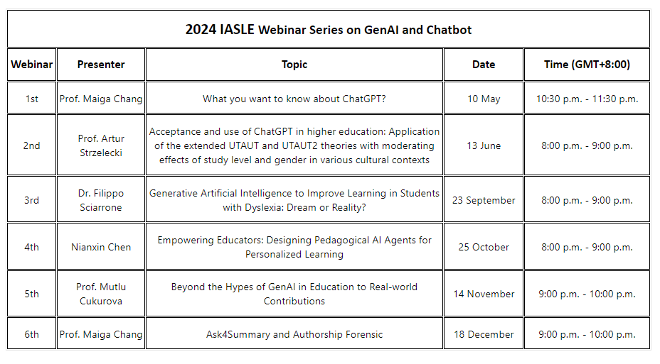 International Assosication of Smart Learning Environments (IASLE, http://iasle.net/) is proud to kick off a series of webinars on generative AI and chatbot for the year 2024. The webinar series will be held online every couple of months and include four to six webinars covering various aspects, angles, practices, guidelines and experiences on the generative AI and chatbot relevant research.
