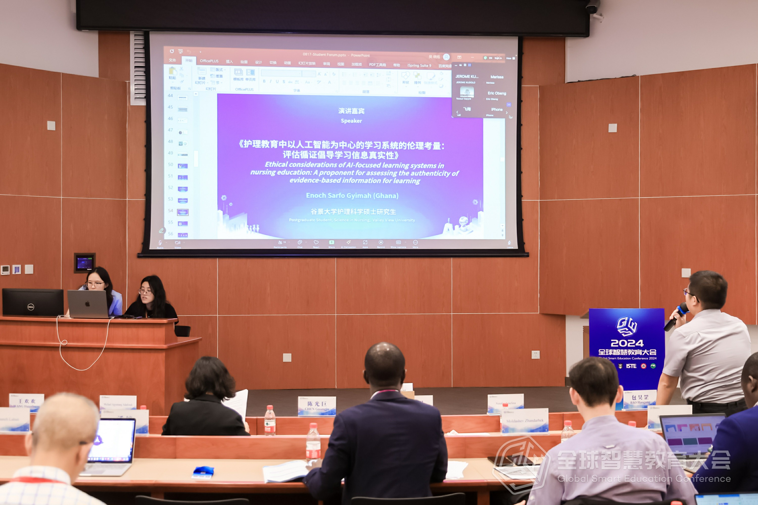Mr. Enoch Sarfo Gyimah, a postgraduate student in Science in Nursing at Valley View University, pointed out the ethical issues in AI learning systems in nursing education, particularly the need for the authenticity of evidence-based information for learning. He proposed selecting and integrating learning resources by expert reviews and AI-aided curation to ensure the quality and reliability of resources; monitoring and evaluating through user tracking and AI-aided analysis to increase transparency and data privacy in the educational process, thus ensuring the authenticity of learning outcomes in nursing education and providing robust support for learners' clinical practice.