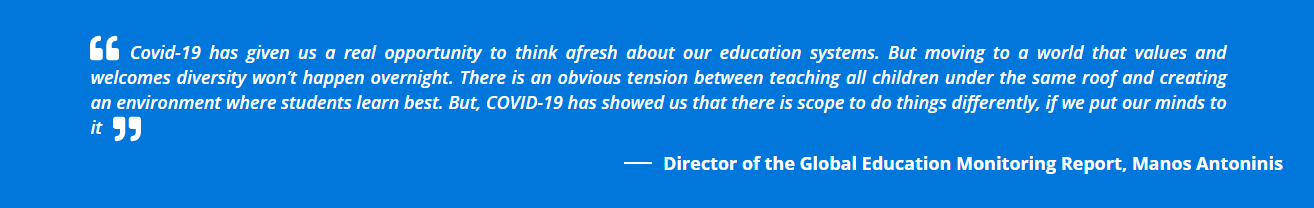 The report provides an in-depth analysis of key factors for exclusion of learners in education systems worldwide including background, identity and ability (i.e. gender, age, location, poverty, disability, ethnicity, indigeneity, language, religion, migration or displacement status, sexual orientation or gender identity expression, incarceration, beliefs and attitudes). It identifies an exacerbation of exclusion during the COVID-19 pandemic and estimates that about 40% of low and lower-middle-income countries have not supported disadvantaged learners during temporary school shutdown. The 2020 Global Education Monitoring (GEM) Report urges countries to focus on those left behind as schools reopen so as to foster more resilient and equal societies.