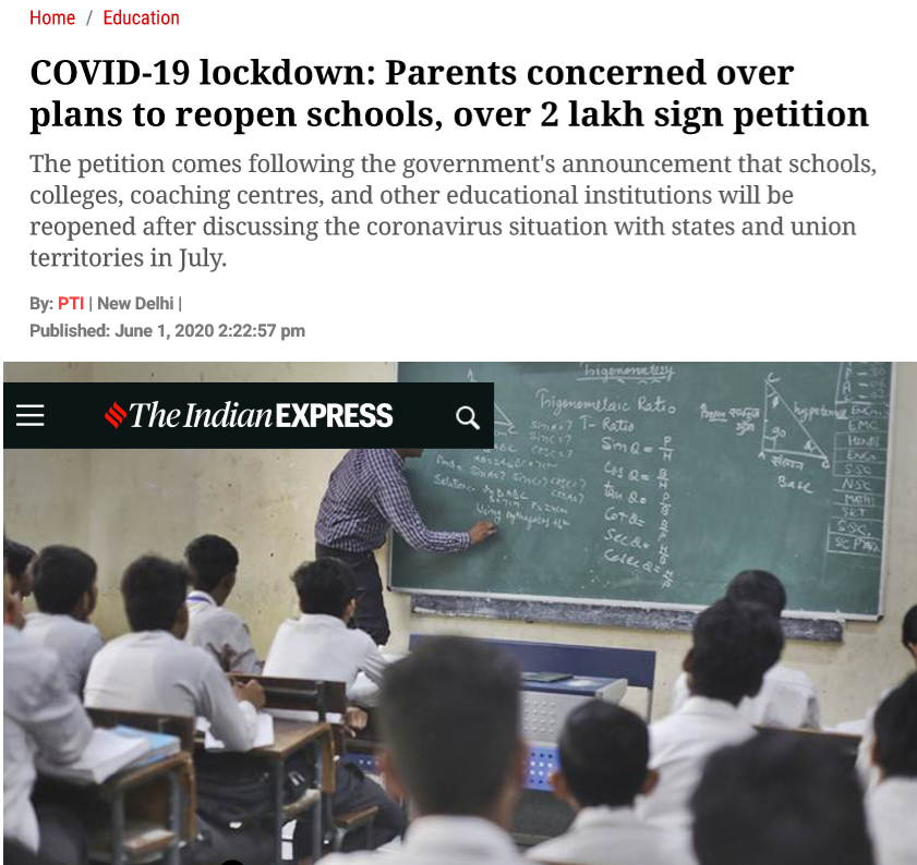 “Opening of schools in July will be the worst decision by the government. It’s like playing with fire when we ought to douse it with full force. The current academic session should continue in e-learning mode. If the schools claim that they are doing a good job via virtual learning then why not continue it for the rest of the academic year,” said the petition, which has been signed by over 2.13 lakh parents.