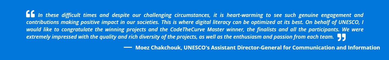 Doreen Bogdan-Martin, Director of the Telecommunication Development Bureau of the International Telecommunication Union, testifies her commitment to this joint effort: “It’s been an inspiration and a privilege to be part of the CodeTheCurve judging panel, and to see so many young men and women from all over the world join forces to confront this formidable global health crisis. Today’s youth are uniquely skilled at harnessing tech to solve the problems that are defining their world. We need to empower them and give them the chance to shape the future they want.”