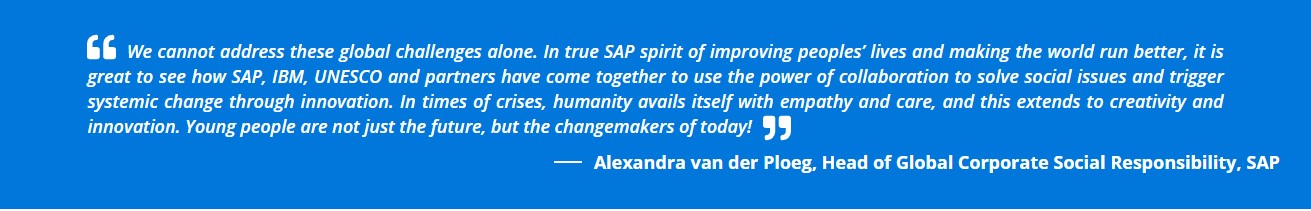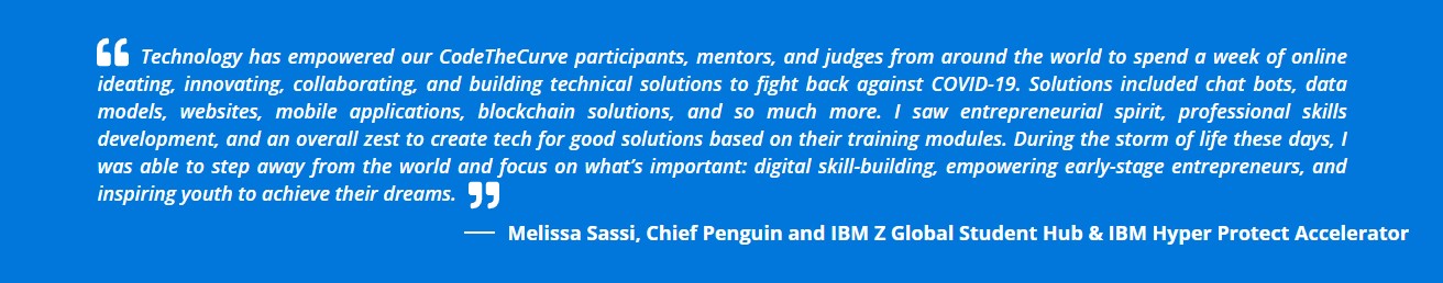 Organized by UNESCO, IBM Z and SAP, CodeTheCurve would not have been possible without the great support of partners such as UN EQUALS, TruChallenge, AngelHack, iHackOnline, Internet Society, Global Accelerator Network, People Centered Internet, FOSSASIA, Global Accelerator Network, Society of Physician Entrepreneurs, REDDS Capital, Village Capital, YPO, and Queen City Fintech.