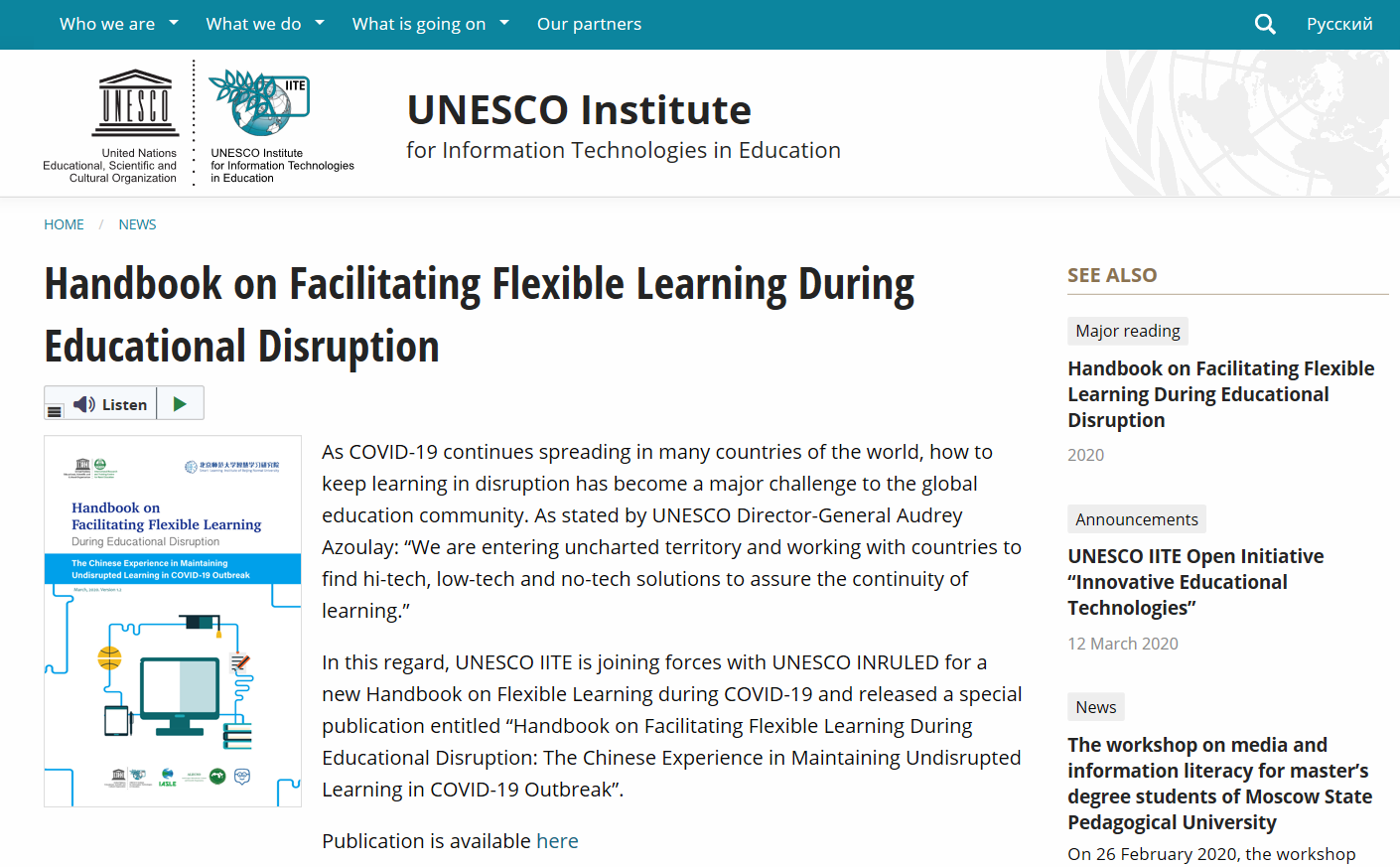 On March 16, 2020, completed by the research team led by Co-Deans Ronghuai Huang and Dejian Liu, the Handbook on Facilitating Flexible Learning During Educational Disruption: The Chinese Experience in Maintaining Undisrupted Learning in COVID-19 Outbreak was released on official website of UNESCO IITE.