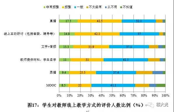 从学生感受看,近60%学生认为“直播”和“线上互动研讨(包括答疑、辅导等)”为频繁使用(含“非常频繁”,本题下同)。不到40%学生认为“录播”和“MOOC”为频繁使用。可见,“直播+线上互动”是本次线上教学的主打模式。(见图17)
