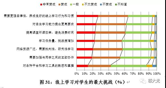 从学生评价看,超过60%赞成(含“非常赞成”,本题下同)“对自主学习能力提出更高要求”、“需要更强自律性,养成良好的线上学习行为和习惯”和“提高课堂听课效率,避免浪费时间”等三个方面的挑战。而对“需要更强自律性,养成良好的线上学习行为和习惯”、“学习任务量、挑战度增加”和“网络资源广泛,需要批判性、研究性学习”三个方面,不到60%学生“赞成”存在着挑战,40%左右学生认为“对各种平台和学习工具的熟悉和掌握”还存在挑战。(见图31)