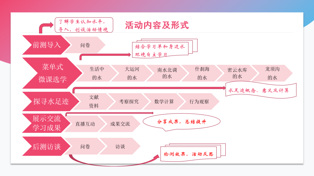 北京市少年宫的赵茜老师在《线上线下融合的项目式水环境主题教育活动》中,围绕北京市的缺水问题,将线上微课和线下水资源探究相结合,采用OMO项目式学习方式,开展小水滴游京城活动。该案例利用信息化手段,突破时间、空间限制,实现资源共享;通过考察探究、科学实验、设计制作等方法,追溯水环境本质及普遍规律,展示交流学习成果,从而解决现实缺水问题。