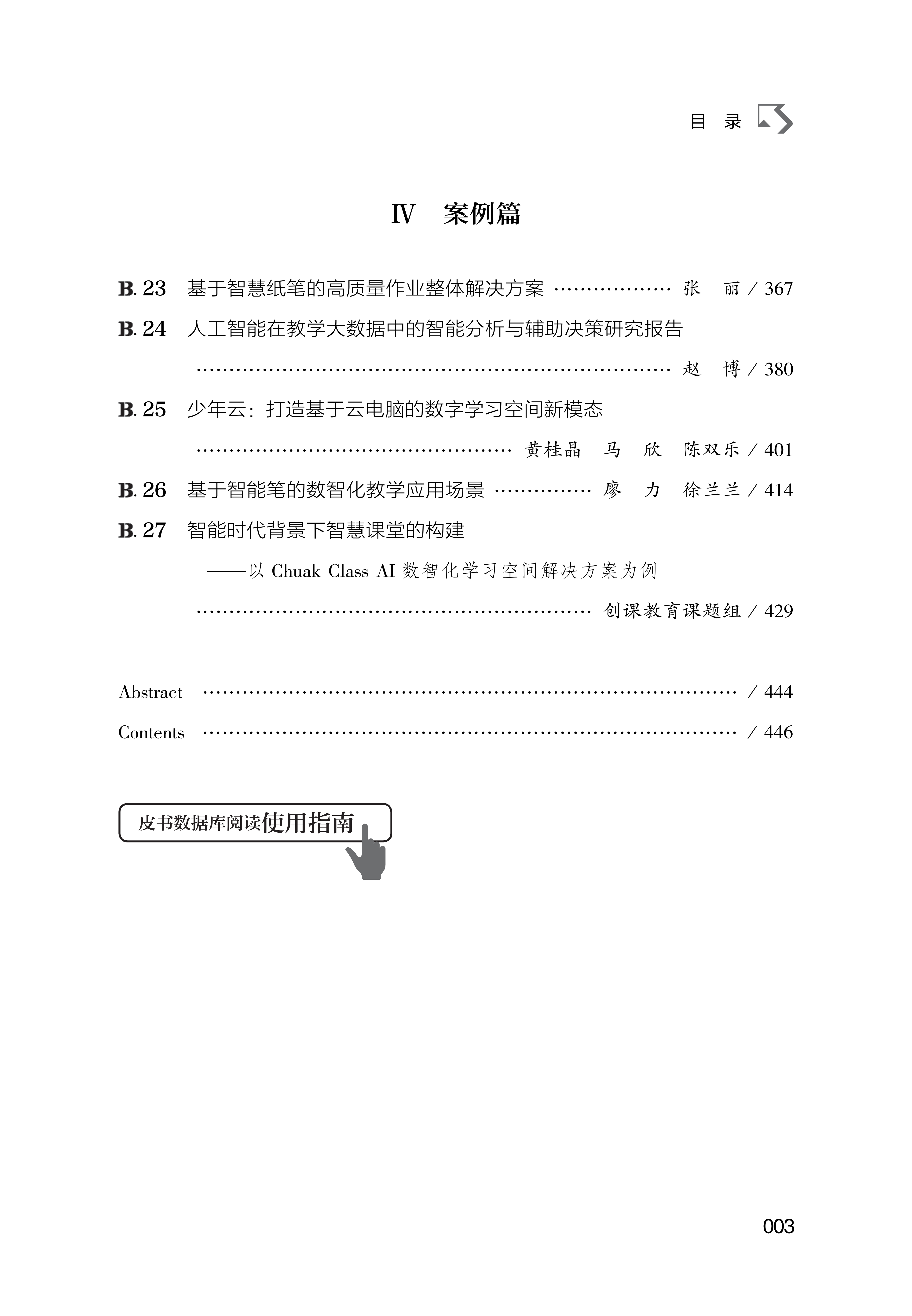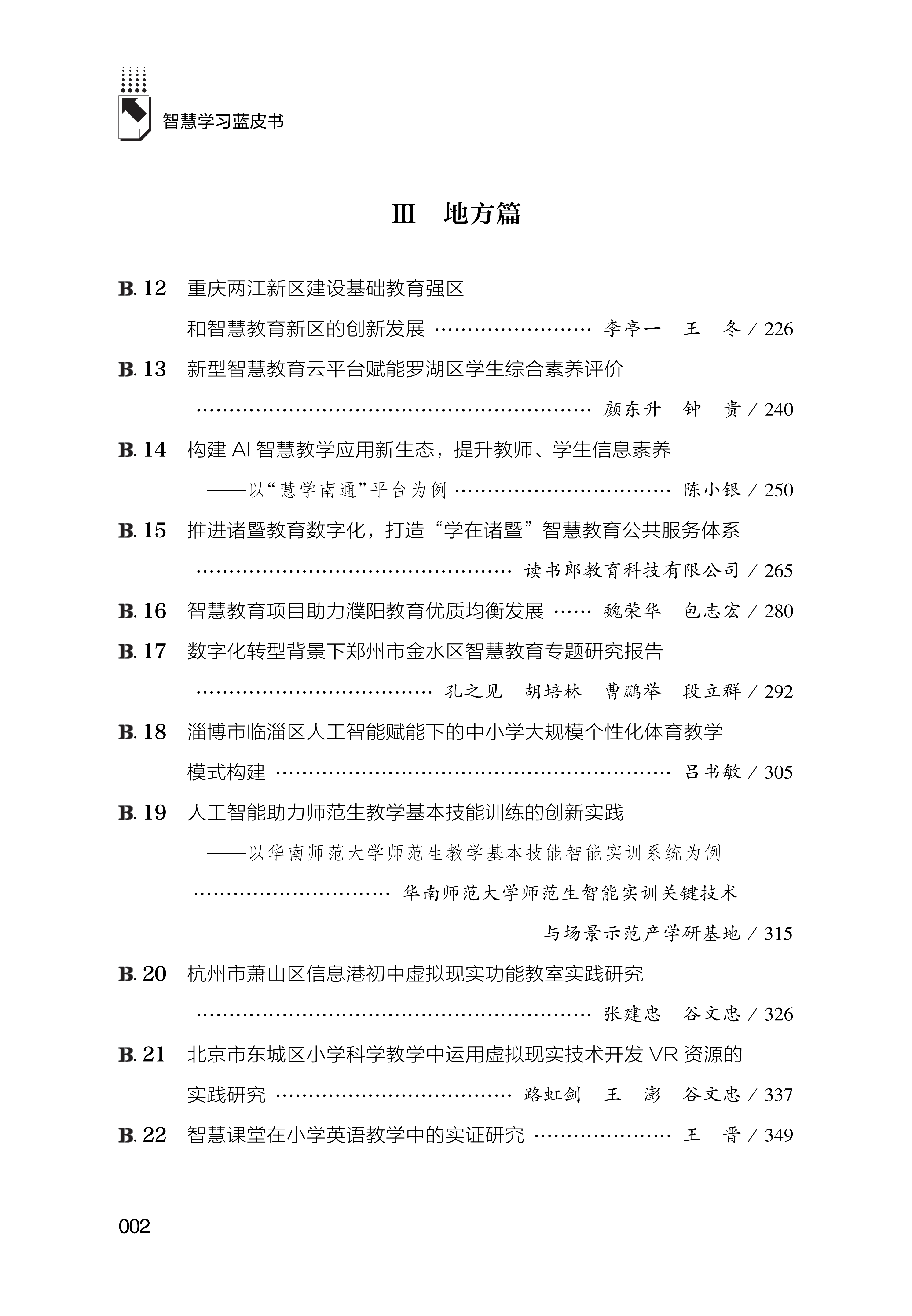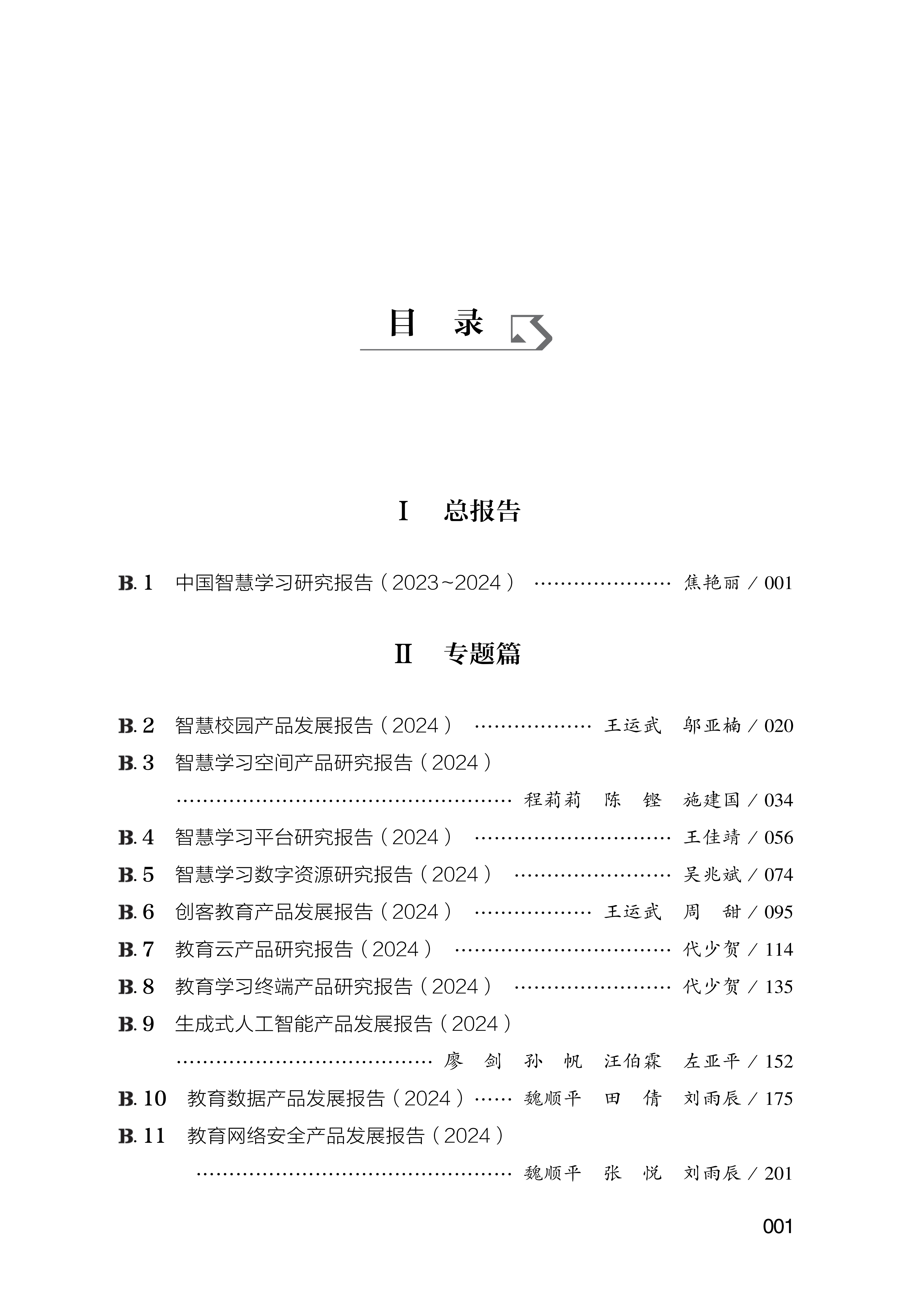 专题篇对智慧校园产品、智慧学习空间产品、智慧学习平台、智慧学习数字资源、创客教育产品、教育云产品、学习终端产品等与学生密切相关的智慧学习产品的特征、应用现状、市场规模做了总结分析。地方篇通过地方和学校使用智慧学习产品提升教育管理水平和治理能力分析,来反映数字技术对于教育数字化转型的现实意义。案例篇从产品供给端介绍了智慧学习产品的设计、服务和应用,体现了企业在响应教育政策、市场需求等方面做出的技术创新和服务升级。