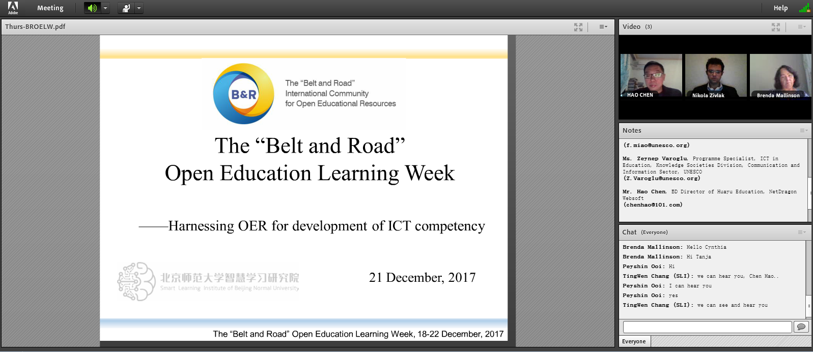 网络研讨2015年,联合国教科文组织通过了《教育2030行动框架》,提出要为实现联合国《2030可持续发展议程》中的可持续发展目标4——“确保全纳、公平的优质教育,促进全民享有终生学习的机会”——而共同努力。中国牵头的“一带一路”倡议自提出以来,为不同大洲、不同发展阶段的国家之间的协作提供了新的契机。同时,不断进步的信息技术为开放教育和开放学习提供了更多可能,也为实现全纳、公平、优质的教育提供了助力。在“一带一路”教育行动中,如何发挥政府的引导作用和学校、企业及其他社会力量的主体作用,活跃教育合作局面,丰富教育合作内涵,有待进一步研讨和探索。学习周旨在通过搭建基于网络研讨会的国际交流与合作平台,推进“一带一路”国家的相关机构就开放教育资源(OER)在教育中的应用采取具体行动,以实现全纳、公平、优质的教育目标及促进全民享有终身学习的机会。学术周设置了5个分论坛:“‘一带一路’国家开放教育资源发展现状”、“实现可持续发展目标的创新性OER实践”、“开放教育资源中的教师、学生和机构角色”、“利用开放教育资源提高信息技术能力”以及“开放教育资源国际合作经验”。联合国教科文组织巴黎总部教育信息技术负责人苗逢春、传播与信息部知识社会处教育信息技术项目专家齐娜普·瓦罗格鲁和广中浄、欧洲远程教育与数字化学习网络协会主席艾瑞娜·瓦伦格维齐亚尼、塞尔维亚创新和技术发展内阁部长顾问兼“一带一路”研究院院长博扬·拉里齐、国际开放和远程教育理事会主席克里斯蒂安·斯特拉肯、黎巴嫩圣母大学副校长法兹·巴朗德等嘉宾作了精彩报告。