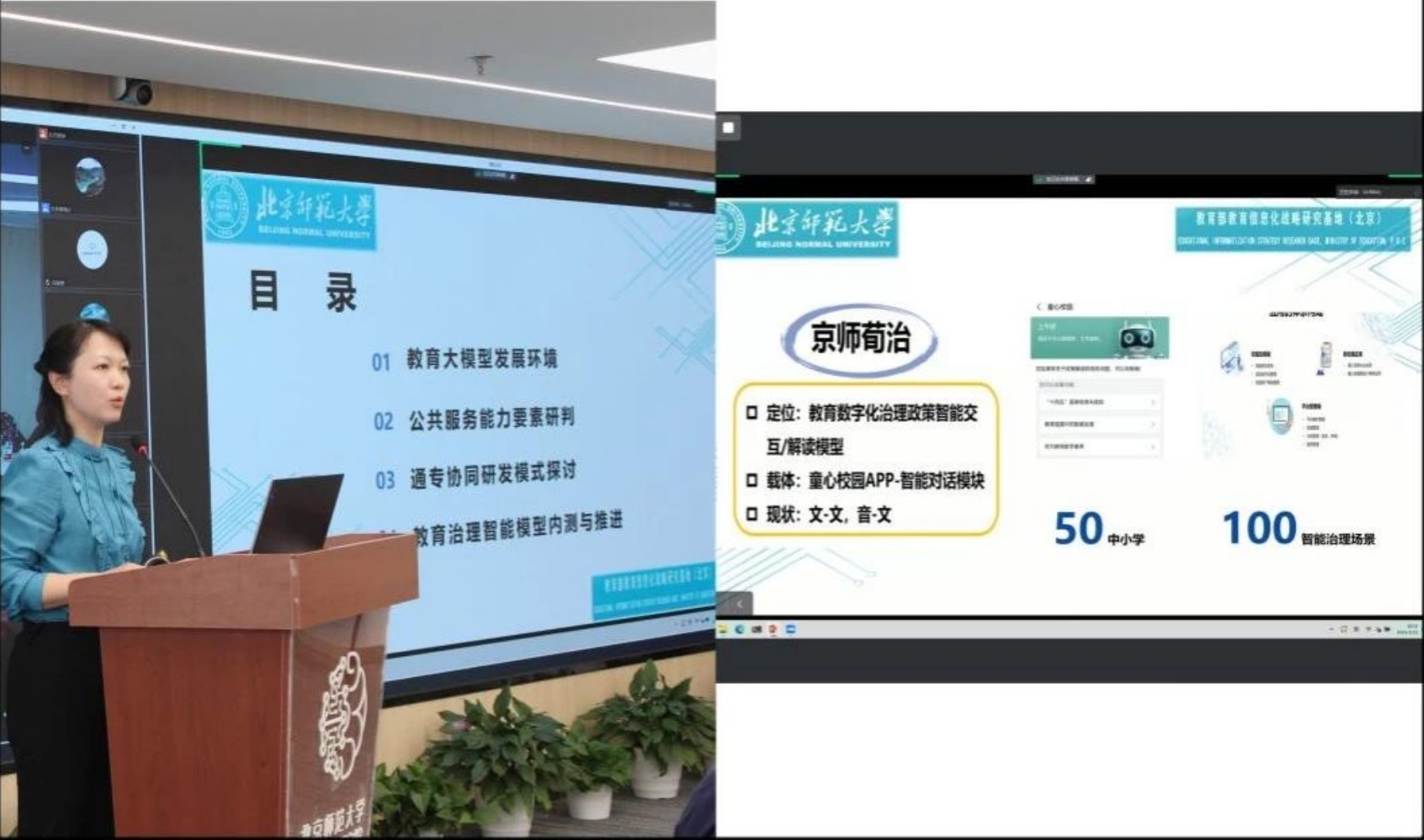 会上,北京基地副主任曾海军首先回顾了2023年工作主要内容,北京邮电大学宋美娜教授介绍了数字教育应用产业生态发展分析,北京基地副主任童莉莉对AI教育大模型的行业调研和自研教育治理智能对话模型“京师荀治”内测版做了发布和后续研发计划介绍。