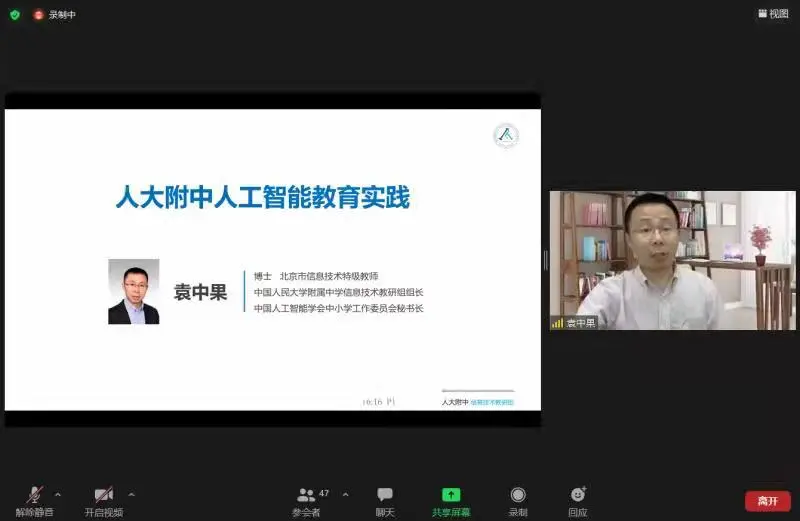 袁中果老师发表了题为“人大附中人工智能教学实践”的主题演讲。袁老师以课程设置、课程实施和共建共享三个方面为切入点,介绍了人大附中的人工智能课程设置与信息技术课程体系。袁老师特别指出,人工智能时代的教育要注重学生的信息社会责任教育和人工智能伦理教育。