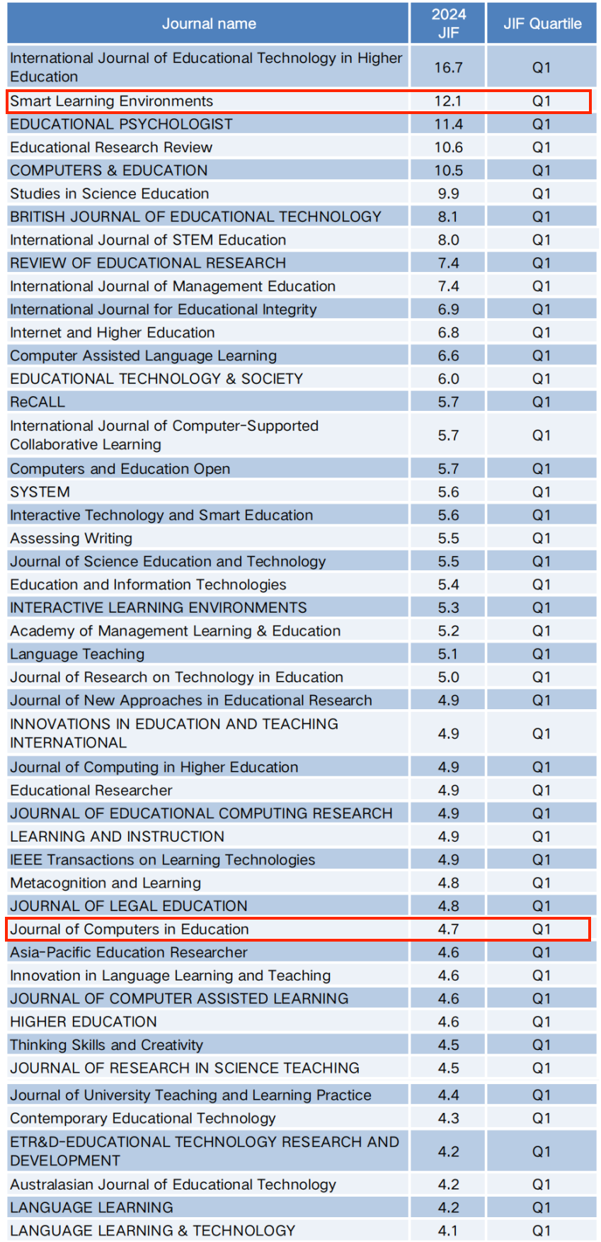 近日,备受学术界瞩目的科睿唯安2025年度期刊引证报告(Journal Citation Reports™, JCR™)正式发布。北京师范大学智慧学习研究院主办的《智慧学习环境》(Smart Learning Environments, SLE)在教育学领域(Education & Educational Research)排名第二,其影响因子为12.1;《计算机教育应用期刊》(Journal of Computers in Education, JCE)排名第三十六,均入围2025榜单的Q1行列。