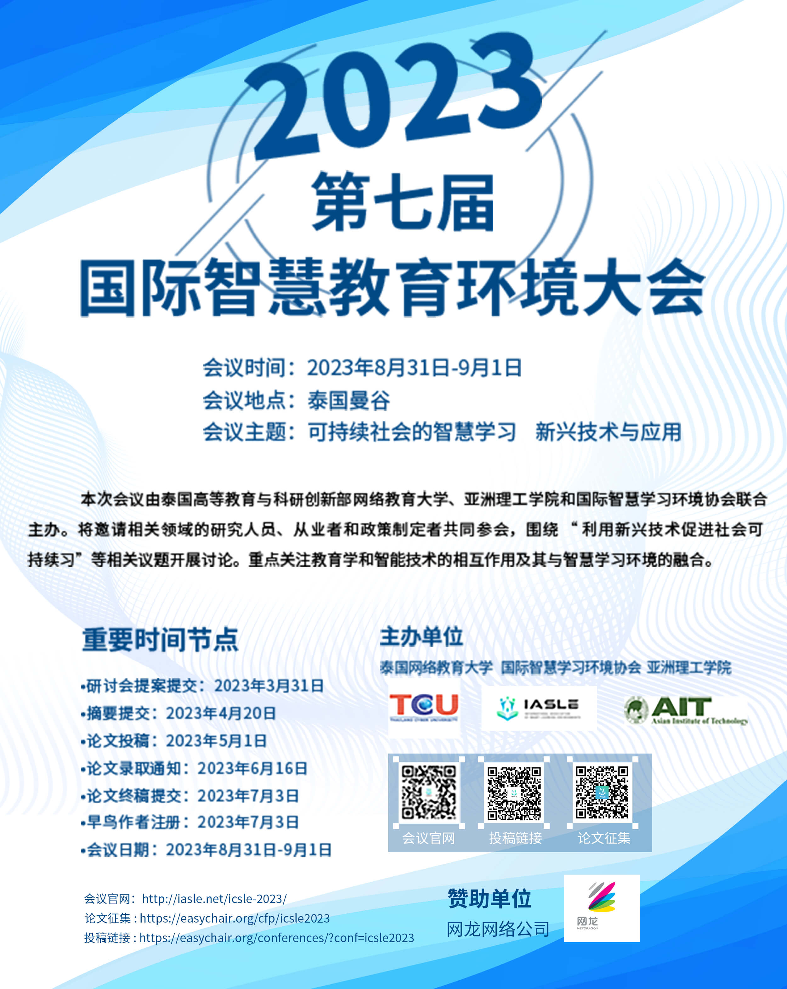 本次会议将由泰国高等教育与科研创新部网络教育大学、亚洲理工学院与国际智慧学习环境协会联合主办,主题为“可持续社会的智慧学习:新兴技术与应用”。会议邀请相关领域的研究人员、从业者和政策制定者共同参会,围绕“利用新兴技术促进社会可持续学习”等相关议题开展讨论。重点关注教育学和智能技术的相互作用及其与智慧学习环境的融合。