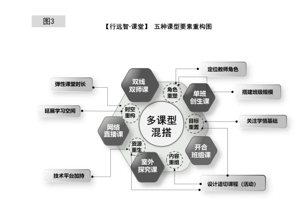 基于此,重庆两江新区行远小学校通过不断迭代式的创新探索,依托智慧教学平台,将课堂要素进行分解与重构,通过延展学习空间、弹性设置课堂时长、重塑师生角色、重新搭建班级规模等,最终形成单班创生、开合班组、室外探究、双线双师以及线上直播五大课型,根据学科特征、学情基础、教学内容等因素,综合选择不同的课堂组织形式,形成了多课型混搭的课堂组织新范式。