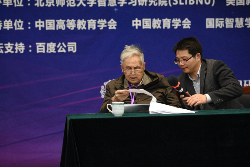 最后,大会成功举办了“人工智能驱动下的未来教育”论坛。论坛由智慧学习研究院与百度时代网络技术(北京)有限公司联合承办,北京师范大学教授崔光佐主持。中国工程院院士李京文,北德克萨斯大学信息学院教授Michael Spector,中国信息科学奠基人、北京邮电大学教授钟义信,新加坡南洋理工大学教授吕赐杰,清华大学“长江学者”特聘教授史元春,百度教育事业部总经理张高博士等出席论坛并作报告。出席此次论坛的还有美国加州州立大学海峡群岛分校技术与通讯副校长Michael Berman、圣哈辛托山学院副校长Niki Whiteside、教育部虚拟现实应用工程研究中心主任周明全、中国物理学会教学委员会副主任杨再石、首都师范大学教授樊磊等20余人。座谈会由台湾中山大学教授陈年兴主持,他们就人工智能在教育应用中的挑战及发展趋势、AI时代背景下互联网企业与高校合作方式探讨两大议题进行了热烈讨论。