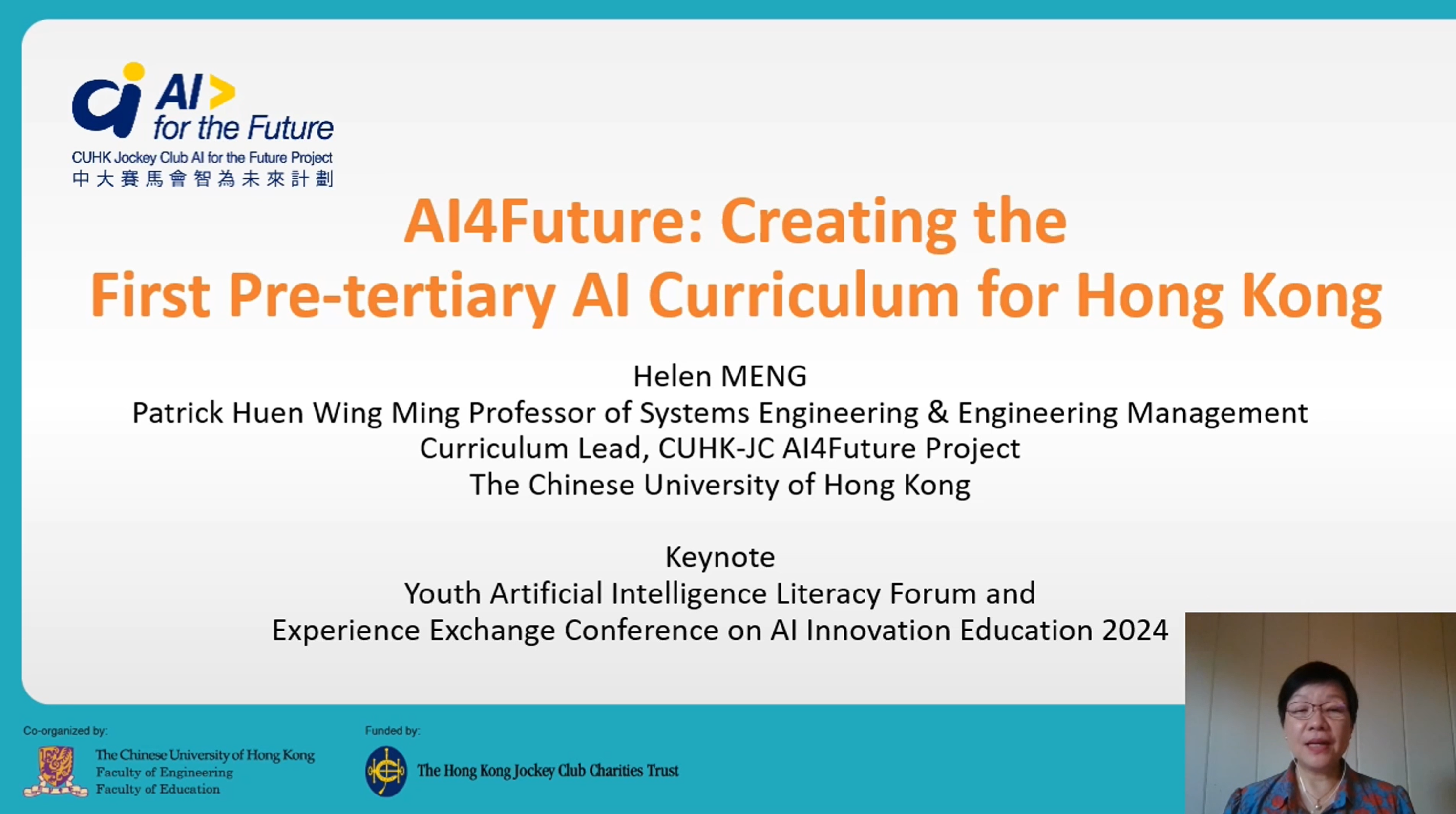 香港中文大学蒙美玲教授的报告以“为香港创建首个高等教育前阶段的人工智能课程”为题,介绍了香港在AI领域取得的显著成就。她提到“中大赛马会未来人工智能项目”是香港第一个与中学合作的项目。此外,蒙教授总结了AI 在未来工作中的角色,指出技术采纳可能会消除一些工作的同时创造出新的工作,并对其未来的发展进行了展望。她认为,我们的未来取决于我们如何驾驭 AI带来的机会和风险。