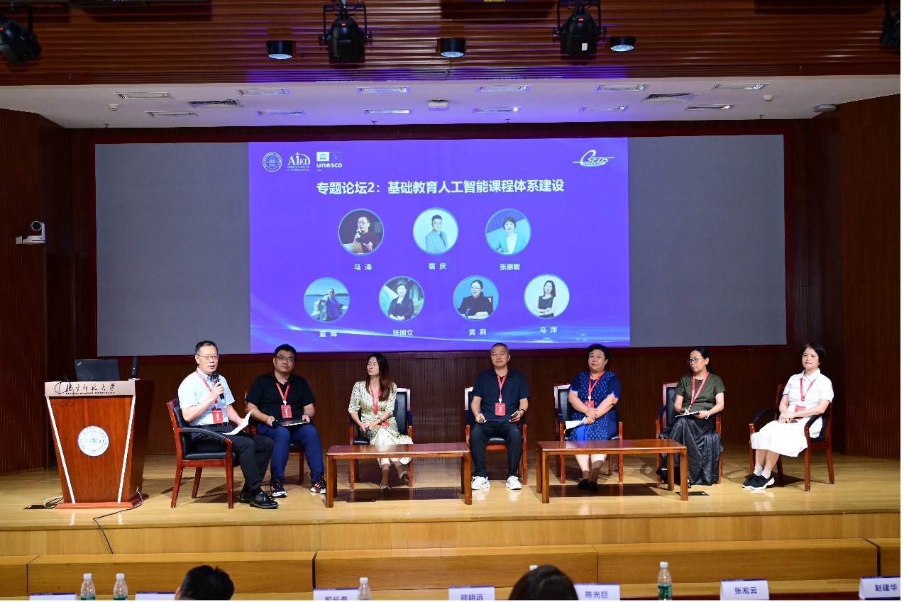 第二场专题论坛由北京教育学院丰台分院副院长马涛担任主持人,六位专家围绕“基础教育人工智能课程体系建设”这一主题展开了深入研讨。其中,西北师范大学教育技术学院副院长宿庆指出了当前人工智能课程设计的弊端,强调要有合理的教育意识和观念引领课程建设。深圳市教育信息技术中心主任张惠敏主任分享了深圳人工智能教育发展的经验。九江市教育技术和装备发展中心主任童晖主任强调了科创实践结合的关键作用。北京市海淀区翠微小学党委书记、校长张国立分享了翠微小学构建课程体系的成果与经验。银川市兴庆区实验第二小学(教育集团)党委书记黄莉介绍了实验二小的举措和成果,包括创建场所、开发课程等方面,强调教师和智慧校园环境的重要性。深圳市优必选科技股份有限公司副总裁马萍提到利用学习平台和空间支持学生参与科研项目推动其AI素养的发展。