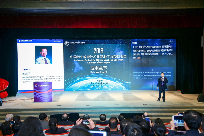 互联网教育智能技术及应用国家工程实验室主任、北京师范大学智慧学习研究院联席院长黄荣怀教授代表项目组发布了该《报告》。这是继智慧学习研究院发布的《2016新媒体联盟中国基础教育技术展望:地平线项目区域报告》和《2017新媒体联盟中国高等教育技术展望:地平线项目区域报告》之后又一重要研究成果。《报告》自2017年8月启动,由112位专家组成“2018地平线项目职业教育专家委员会”,采用德尔菲法,经过“桌面研究”、回答研究问题、多轮投票和案例收集等阶段,最终提出了中国职业教育领域推动技术应用的九大关键趋势,影响技术应用的九项重大挑战和十二项教育技术的重要发展,反映了未来五年我国职业教育领域教育技术应用的总体态势。