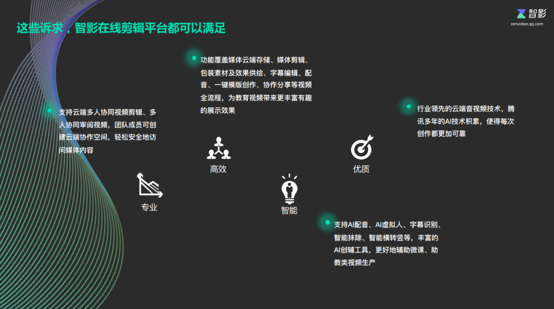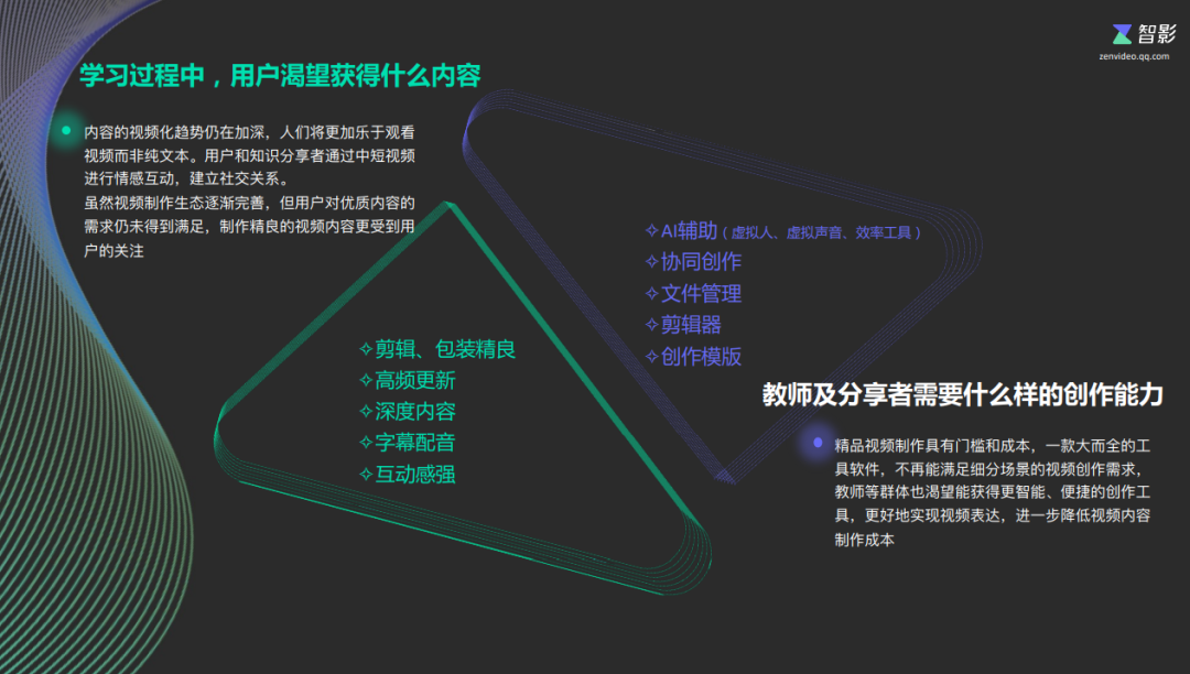 陈老师介绍,近年来,短视频持续沉淀庞大流量,中视频用户增长迅速。数据显示,在2021年底我国短视频用户已达9亿用户,涵盖学生、职场等多元化群体。许多博主通过视频等形式来传递知识。智影平台人工智能视频创作平台集云端素材存储、字母编辑、模板创作等功能于一身,且对配置环境无要求,在线即可剪辑创作。