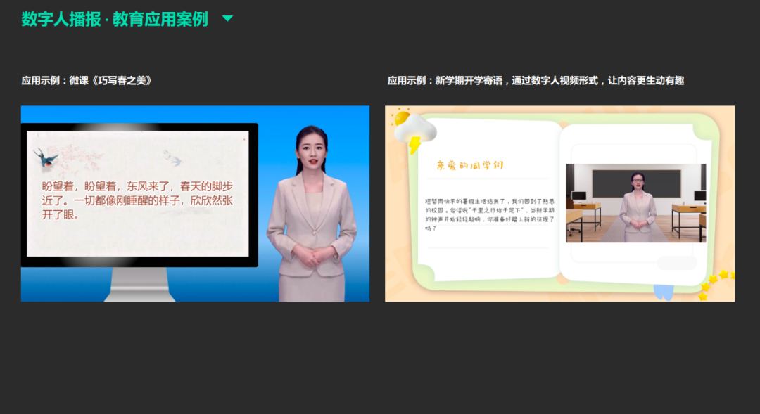 陈老师指出,“数字人”产品的核心是基于文本生成音频。产品前期是通过真人模型实现人物的深度学习,实现文本数字人形象的结合。对用户而言,上手容易,操作简单,使用场景广泛。数字人播报主界面分为三个板块:形象选择(外貌、服装、表情、手势动作等)、作品模块、草稿模块。视频成品支持链接、小程序分享形式,支持教师之间教案的讨论交流或师生之间分享。