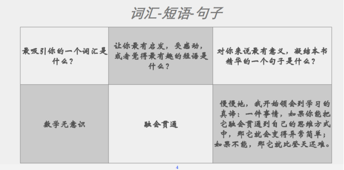 吕秀琴老师主要分享了自己在书本内容和阅读过程两个方面的收获。吕老师提到“数学无意识”。在这部分内容中,作者通过大量的案例阐述了很多学生学不好数学的原因:学校公式化的数学教学与孩子们的现实生活脱节,只是为了做题而做题,孩子们失去了学习数学的动力。吕老师认为:一件事情,如果我们把它融会贯通到自己的思维意识中,这件事情就会变得异常简单。