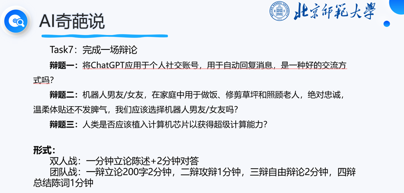 8月14日下午,夏令营开展提问技巧比赛来对比多个模型之间的差异,并开展以小组为单位的辩论比赛,同学们在比赛中学习了prompt相关概念、大语言模型对比以及AI不断进化带来的影响。在问题挑战赛中,大家自由提问,针对ChatGPT、其他大模型与搜索引擎分别提问,经过详细对比,探讨这些答案的准确性、详细程度以及适用范围。在AI伦理问题辩论赛中,同学们围绕与现实生活相关的三个辩题开展辩论。