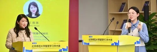 作为往届大赛的获奖者,北京师范大学附属中学王薇薇老师介绍了一项基于“过程性数据反馈技术”的英语写作精准化教学研究,北京师范大学研究生曹舒旻分享了她与团队设计的一个基于AIGC和虚拟现实技术的异质学习空间。