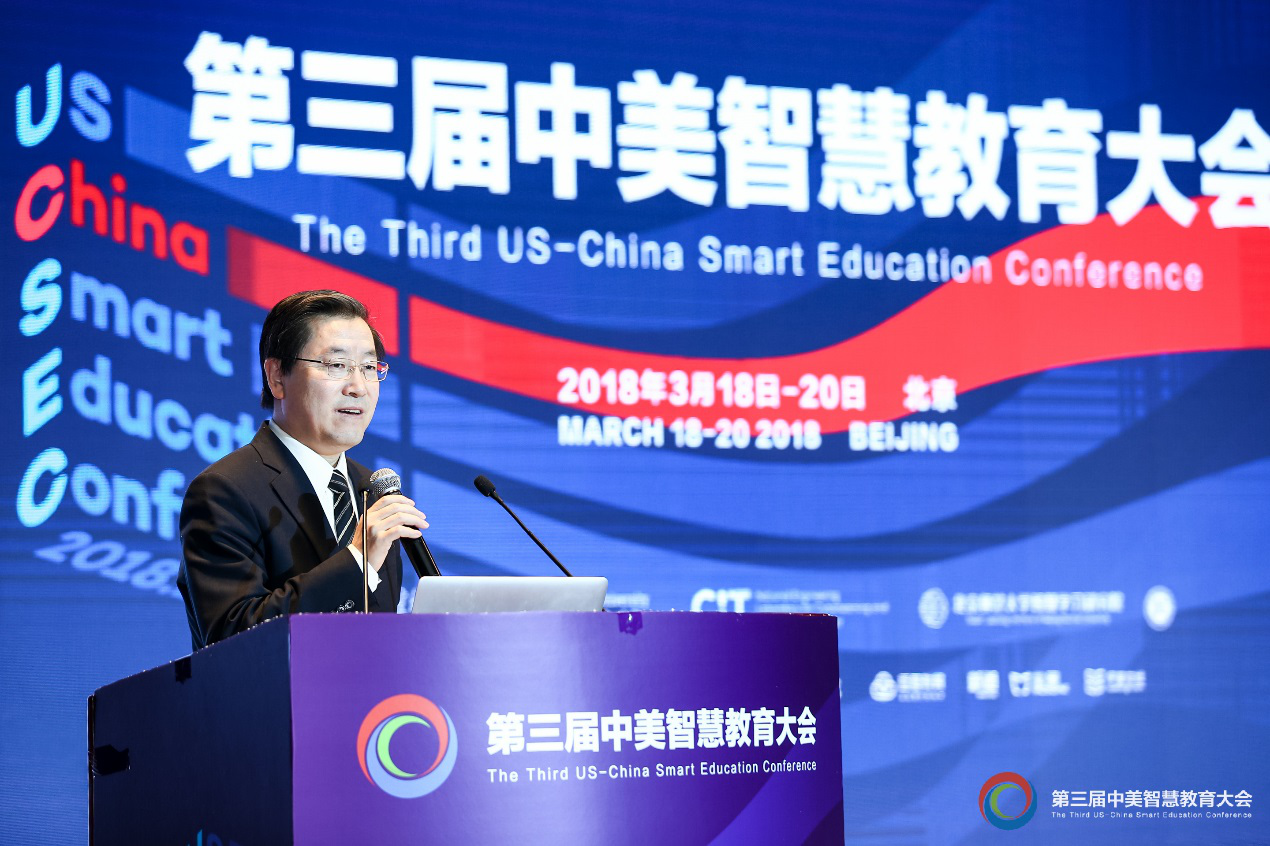 3月18日,第三届中美智慧教育大会在北京国际会议中心开幕。本次会议由北京师范大学、互联网教育智能技术及应用国家工程实验室联合主办,北京师范大学智慧学习研究院、美国教育传播与技术协会、中国教育与社会发展研究院承办,中国工程院院士潘云鹤、赵沁平,教育部科技司司长雷朝滋,北京师范大学校长董奇,中国教育学会会长钟秉林,美国教育传播与技术协会(AECT)主席Eugene G. Kowch等中美两国教育科技界的知名专家围绕人工智能2.0和教育信息化2.0前沿话题展开了深入研讨。会议由北京师范大学副校长周作宇主持,来自研究机构、学校和企业的800多名代表参加了会议。