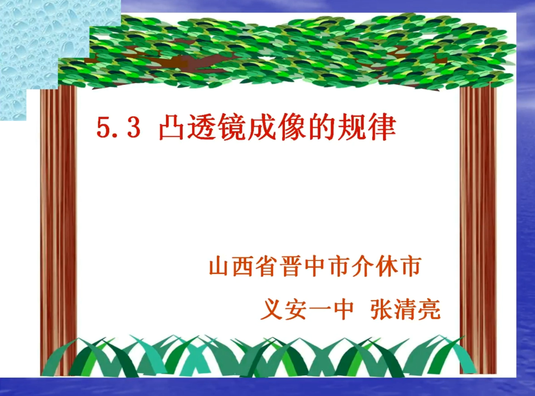 作品简介:本课是人教版八年级物理教材书下册5.3《凸透镜成像规律》的微课,通过探究凸透镜成像过程中物距在各个阶段的变化如何决定像距的变化及成像的性质,总结出凸透镜成像规律及其应用。