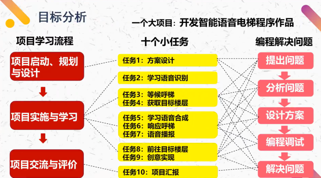 张加莎老师认为,在教学过程中要进行内容分析、学情分析、目标分析,其中目标分析要结合课标中的学段目标、学业要求和教学提示等,确定教学目标,从重难点、单元目标、落实核心素养等方面分别展开分析。围绕开发智能语音电梯程序作品项目开展教学,并结合项目学习的流程以及编程解决的一般过程,将项目拆解为十个小任务,分布在六个课时当中。
