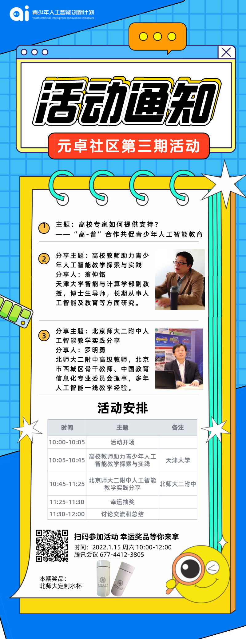1月15日,由北京师范大学发起的“青少年人工智能创新计划”(又称“元卓计划”)在线举办了第二期社区活动,主题为人工智能在未来智慧教育中的创新应用。近百名参与者就开展人工智能教育面临的挑战和解决方案、科研机构所提供平台的具体使用、计算思维和逻辑思维的培养等问题进行了分组研讨和交流,取得了良好反响。本周六(1月22日),我们将迎来元卓计划第三期社区活动,本期主题是:高校专家如何提供支持?活动邀请天津大学智能与计算学部和北京师范大学第二附属中学的教师给大家带来精彩的分享。除主题分享和讨论交流之外,本次活动也安排了幸运抽奖,看看这次又有哪些幸运儿?