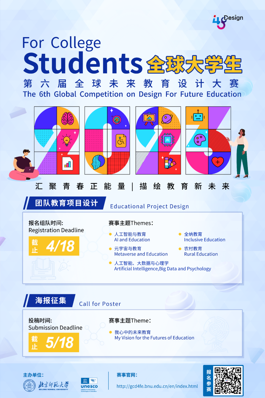 由北京师范大学和联合国教科文组织教育信息技术研究所主办的“第六届全球未来教育设计大赛”已于3月1日拉开帷幕并正式进入报名阶段。本次大赛除了往年已发布的“人工智能与教育”、“元宇宙与教育”、“农村教育”、“全纳教育”等主题外,还新增了“人工智能、大数据与心理学”主题,由北京师范大学心理学部具体策划和指导。