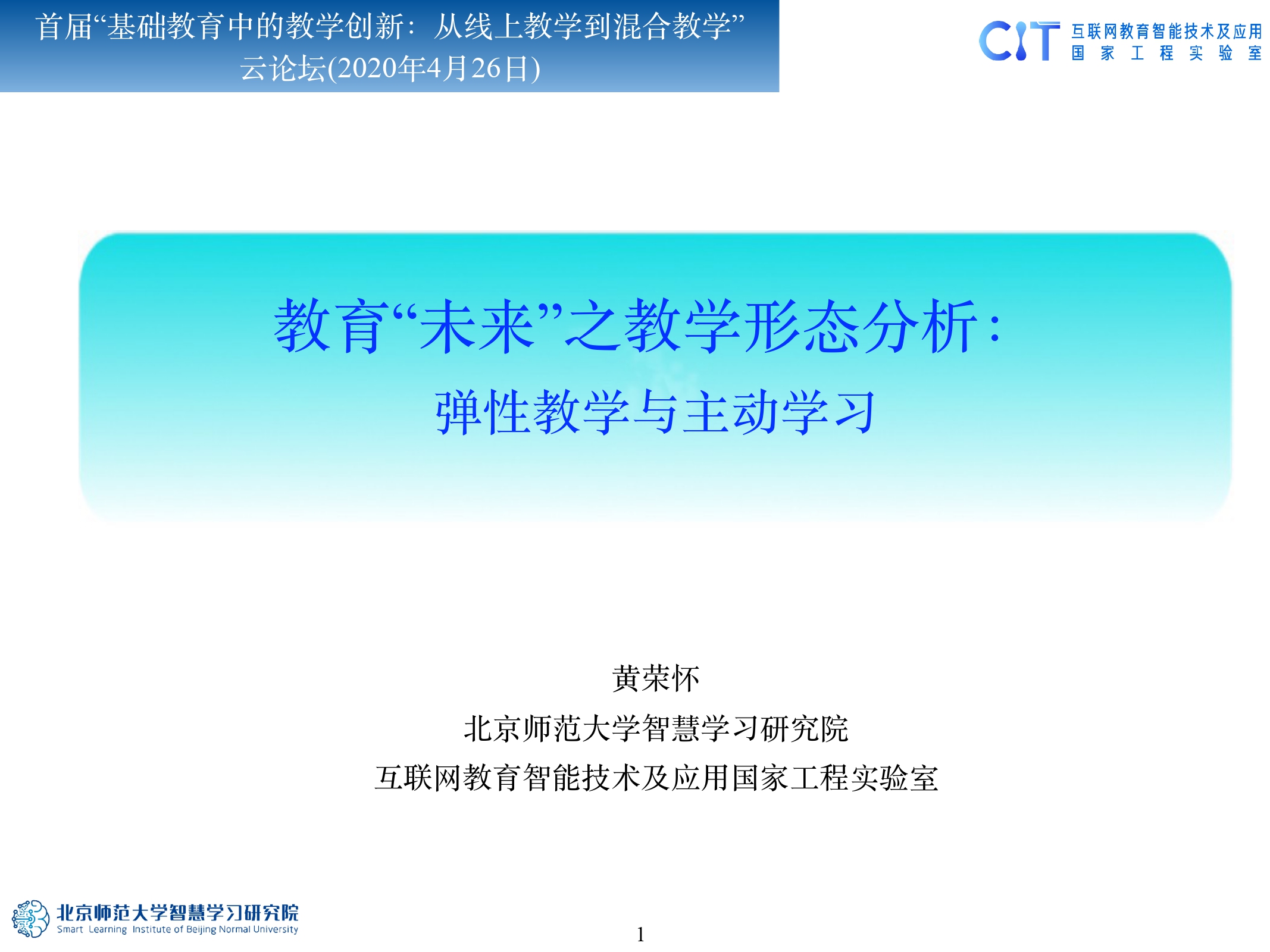 当前,在新冠疫情影响下,基础教育全面采用了线上教学,随着国内疫情控制,即将逐步发展到线上与线下结合的混合教学。为了探讨这种教学创新的基本问题和核心问题,展现具有典范意义的思考与经验,提出具有创新思想的改进建议,2020年4月26日,教育部人文社会科学重点研究基地华东师范大学基础教育改革与发展研究所、华东师范大学开放教育学院,联合主办首届“基础教育中的教学创新:从线上教学到混合教学”云端论坛,论坛将邀请领导、高校研究人员、教师教育培训者和中小学优秀教师代表发言分享。 黄荣怀教授受邀担任主讲人,为大家讲解“教育‘未来’之教学形态分析——弹性教学与主动学习”。