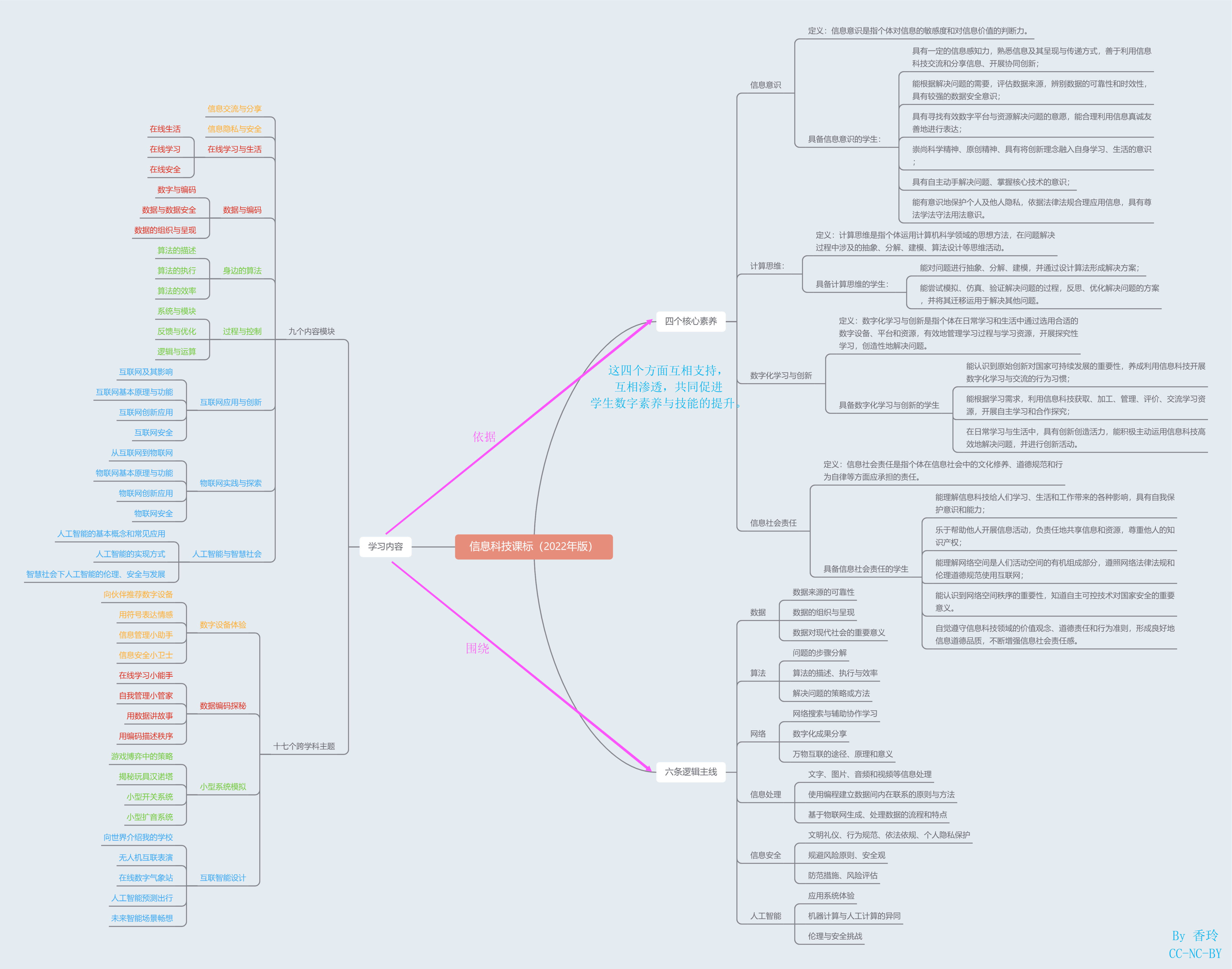 2022年4月22日,义教信息科技新课标正式颁布,专家们的课标解读活动陆续开展。北京师范大学公益项目元卓计划社区活动“元卓学堂”,在5月8日开展了《义务教育信息科技课程标准(2022版)》学习交流活动,首次从教研员、一线教师的角度对新课标进行了研讨,旨在帮助信息科技教师们尽快熟悉课标,更好地开展教学工作。近期,北京教育学院张香玲老师对义教信息科技新课标进行了梳理,总结出了“四-六-九-十七”四个数字,即:“四个核心素养、六条逻辑主线、九个内容模块、十七个跨学科主题”,相关思维导图如下,供老师们参考。
