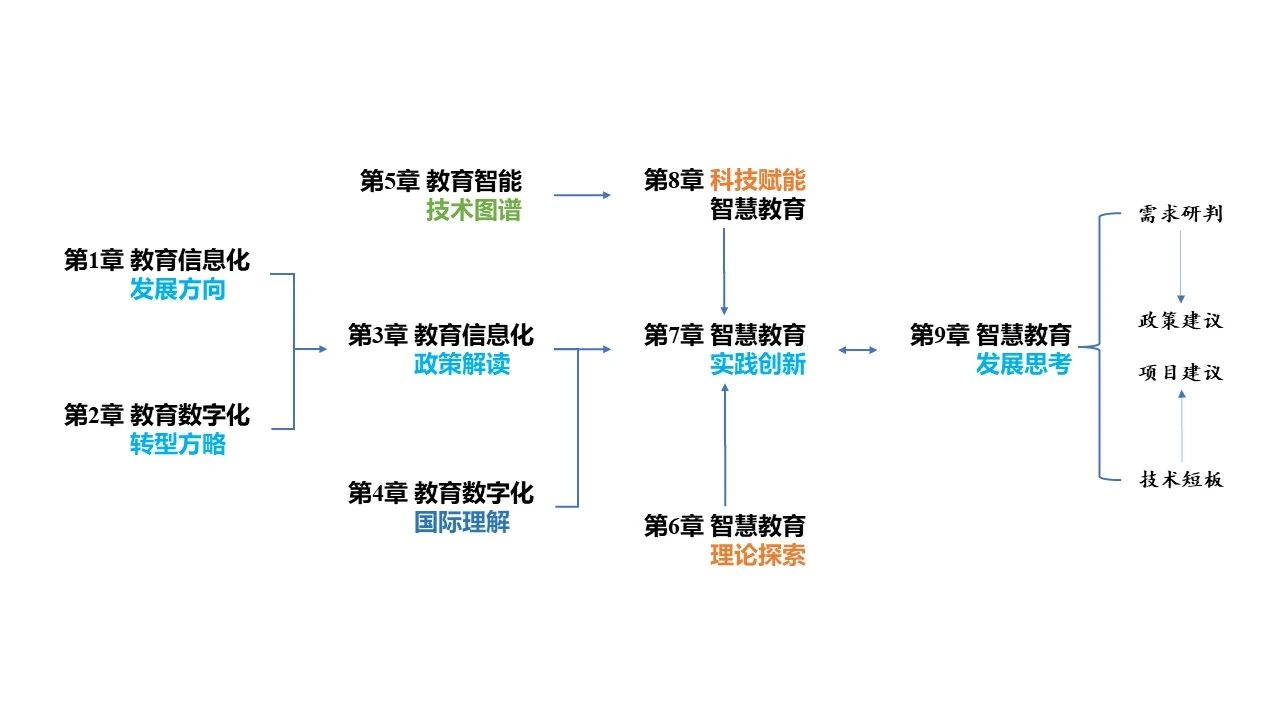 教育信息化、教育数字化(转型)、智慧教育、智能教育、互联网教育和在线教育等概念体现出不同的战略或政策背景,生成了不同的话语体系,囿于作者水平有限,我们并没有对这些概念做出严格内涵和外延界定,主要探讨的就是信息技术与教育教学的深度融合。本书结构框架如下图所示。