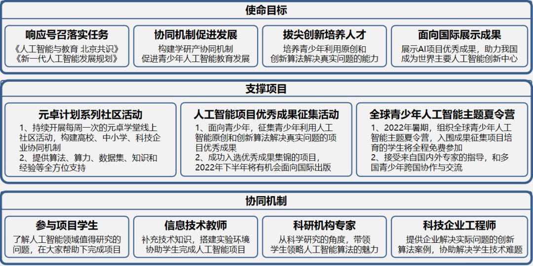元卓计划鼓励青少年利用人工智能原创和创新算法解决真实问题,构建高校、中小学、科技企业协同机制,征集青少年人工智能项目进行培育,并提供算法、算力、数据集、知识和经验等全方位的支持,促进青少年人工智能教育发展,面向国际展示优秀成果,助力我国成为世界主要人工智能创新中心。