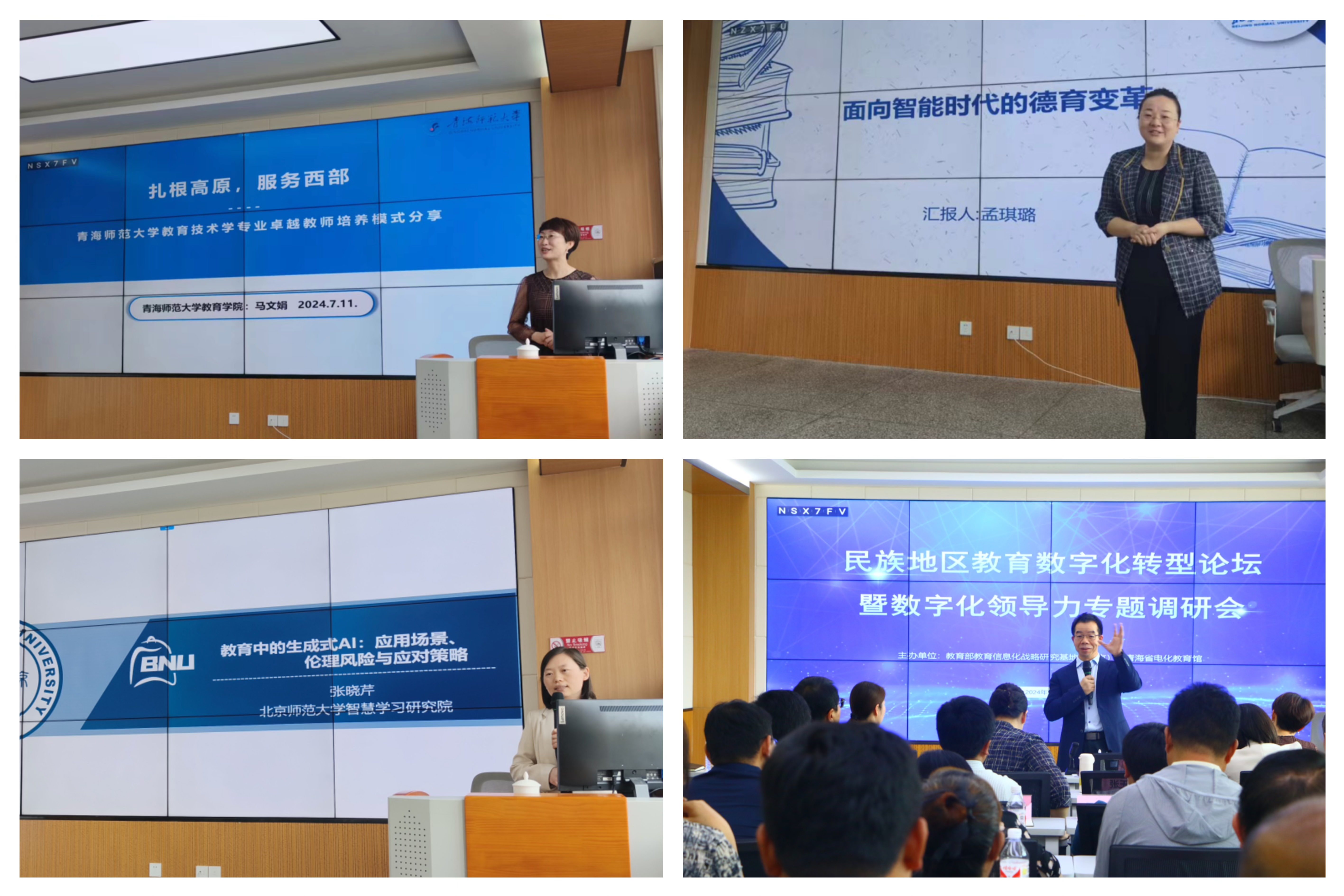 主旨报告环节,马文娟围绕“扎根高原,服务西部”的主题分享了青海师范大学教育技术学专业卓越教师培养模式,从教育数字化转型下的专业人才培养、师范生数字技能与素养培养和师范生顶岗支教回音三个方面介绍了师范生培养情况。孟琪璐作题为《面向智能时代的德育变革》的主旨报告,从时代背景、现实挑战、教育应对、如何赋能四个方面介绍了面向智能时代的德育变革。张晓芹作题为《教育中的生成式AI:应用场景、伦理风险及应对策略》的主旨报告,探讨了不同场景下的生成式AI伦理风险,分享了建立生成式AI使用指南、开展教师培训、学生AI素养教育、重新定义学术诚信标准等应对策略。会议期间,青海省各市(州)、县基层教育工作者结合自身工作,就师生数字素养薄弱、师生数字德育建设等问题展开了交流与探讨。