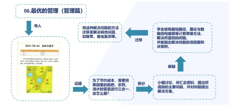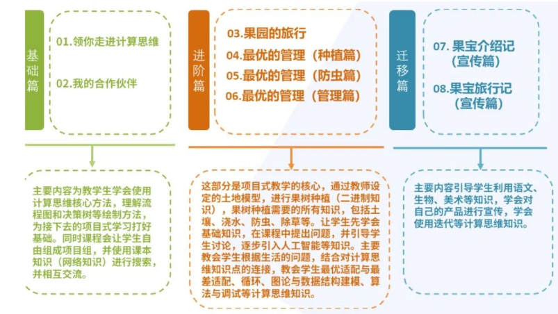 关于课程设计思路,曹老师认为,首先,应该进行课程内容提炼,在进行课程教学时不能离开学科知识内容本身,要从信息技术课程内容中提炼出核心要点,融入项目式教学中;其次,在计算思维领域中抽取学生需要掌握的知识点作为支撑。