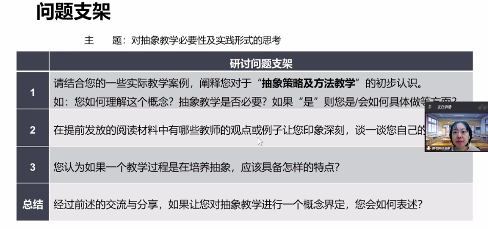 霍丽媛老师组的研讨总体围绕问题支架展开,脉络清晰。组员们一致认为抽象教学的重点在于教学策略,例如,用 “图示”的方法来进行抽象教学是很好的落脚点。但“图示”的方法仅适用于中低水平的学生,对于优秀的学生来说“图示”是隐藏在他们思维之中的。