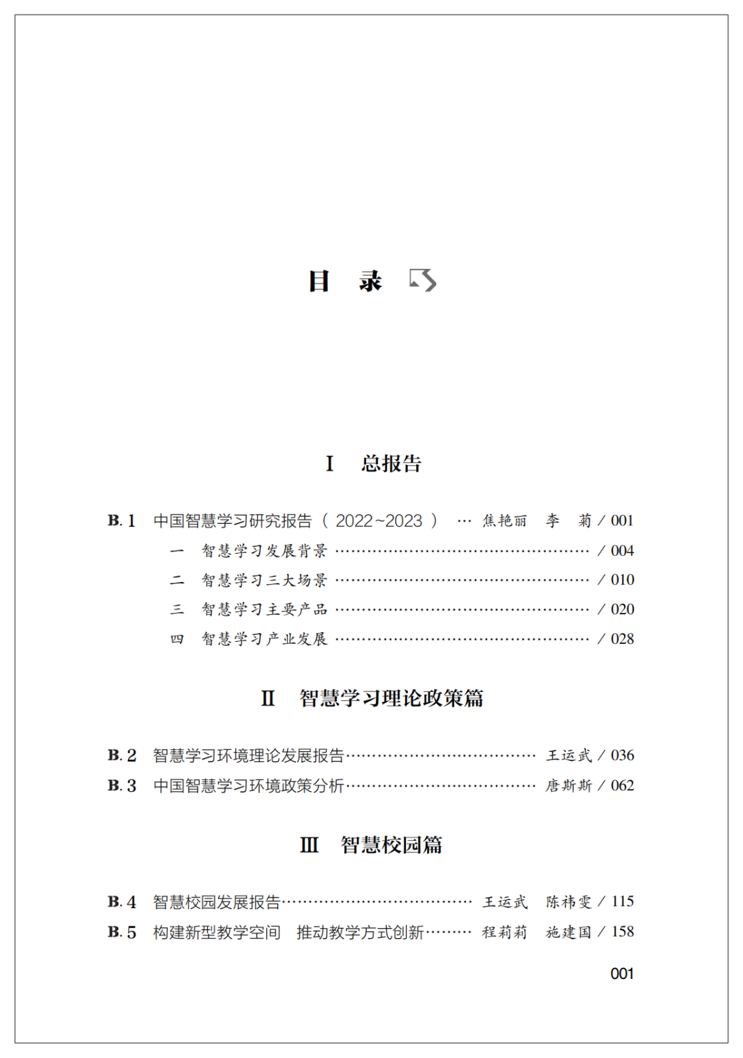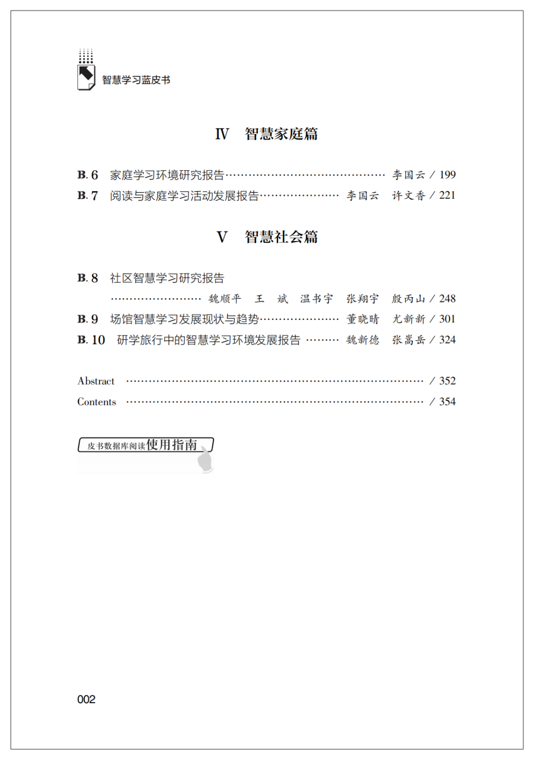 全书由总报告、理论政策篇、智慧校园篇、智慧家庭篇、智慧社会篇五部分构成。总报告从智慧学习发展背景、智慧学习的三大场景、智慧学习主要产品、智慧学习产业发展四个方面呈现智慧学习的样态、状态和业态,并提出智慧学习是建设终身学习的学习型社会的必然要求和建设智慧社会的必然趋势,重点介绍了家长素养、智慧校园、新型学习空间、智慧社区、场馆学习等智慧学习场景的具体内容。