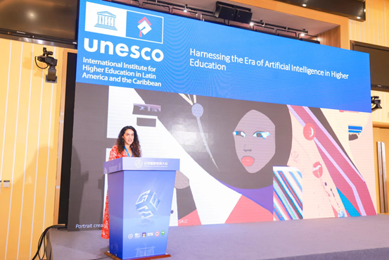 联合国教科文组织拉丁美洲及加勒比地区国际高等教育研究所研究分析员Arianna Valentini作了题为Harnessing the Era of Artificial Intelligence in Higher Education的主题报告。她介绍了人工智能在个性化学习、教育研究和教育管理中的重要作用,分析了未来发展过程中的挑战和伦理问题,并指出人工智能将深入到我们的日常生活中,为每个专业人士服务,而不仅在STEM领域。