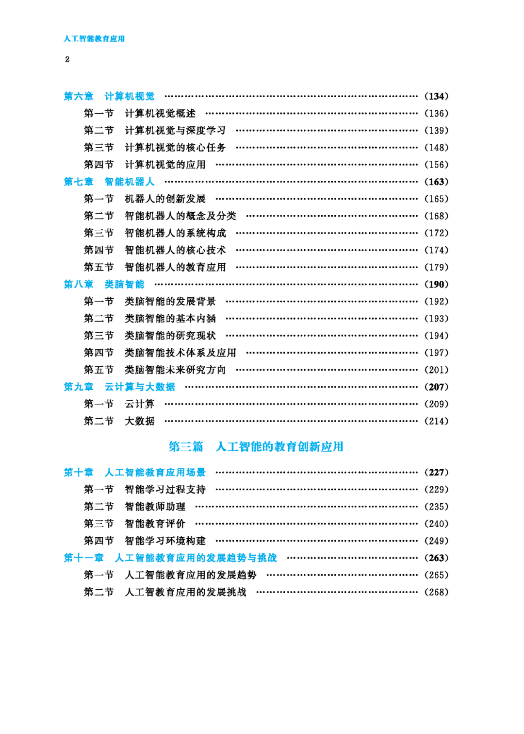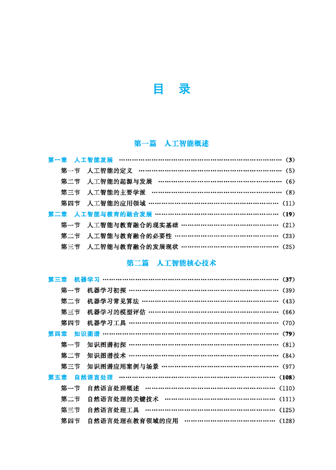 为了更好地赋能人工智能与人才培养的深度融合,为我国产业升级培养创新型人才,我们立足人工智能重朔教育新形态的时代背景,主要面向大学生汇编了本教材。本教材包括三篇十一章。第一章梳理了人工智能的起源与内涵、发展历程及主要学派,重点阐述了人工智能的主要应用场泉;第二章提炼了人工智能与教育融合的发展历史、现实基础、必要性以及发展现状,帮助学习者更好地认识到人工智能与教育融合发展的时代背景和现实需求;第三章讲解了机器学习的概念、历史、 常见算法、 模型评估方式以及常见数据集和计算框架, 以帮助学习者对机器学习方法形成系统的认识,为后续人工智能相关技术的学习打下基础;第四章介绍了知识图谱的概念、技术以及典型的应用案例;第五章介绍了自然语言处理的定义、关键技术、处理工具及其在教育领域的创新应用;第六章介绍了计算机视觉的概念、 经典神经网络结构、核心任务及其应用;第七章介绍了智能机器人的概念、分类、系统构成及核心技术,并总结了现有智能机器人在教育领域的应用情况以及发展趋势;第八章介绍了类脑智能的发展背景、基本内涵及技术体系,并探讨了类脑智能未来研究方向;第九章介绍了云计算与大数据的基本原理、技术方法,及其对教育体系变革与创新的促进作用;第十章梳理了人工智能在学习过程支持、 教师助理、 教育评价以及学习环境构建四个方面的典型应用;第十一章展望了人工智能与教育融合应用的发展趋势与面临的挑战。