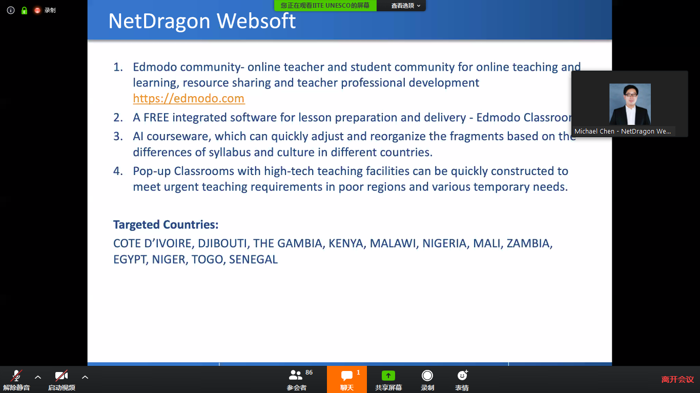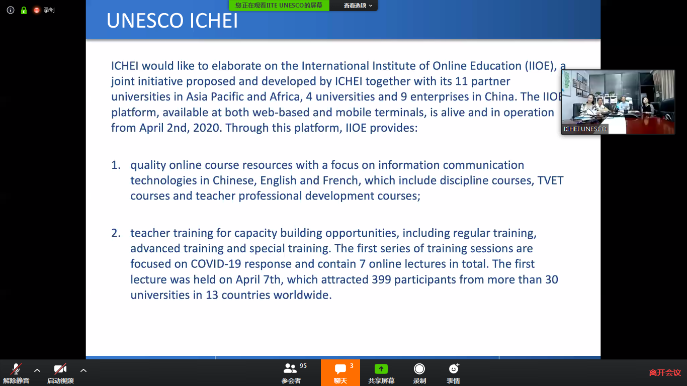 联合国教科文组织内罗毕办事处(UNESCO Nairobi)、非洲国际能力培养研究所(UNESCO IICBA)和教育信息技术研究所(UNESCO IITE)于北京时间4月28日23时,联合举办了合作伙伴在线会议,主题为疫情期间共同推动非洲发展。