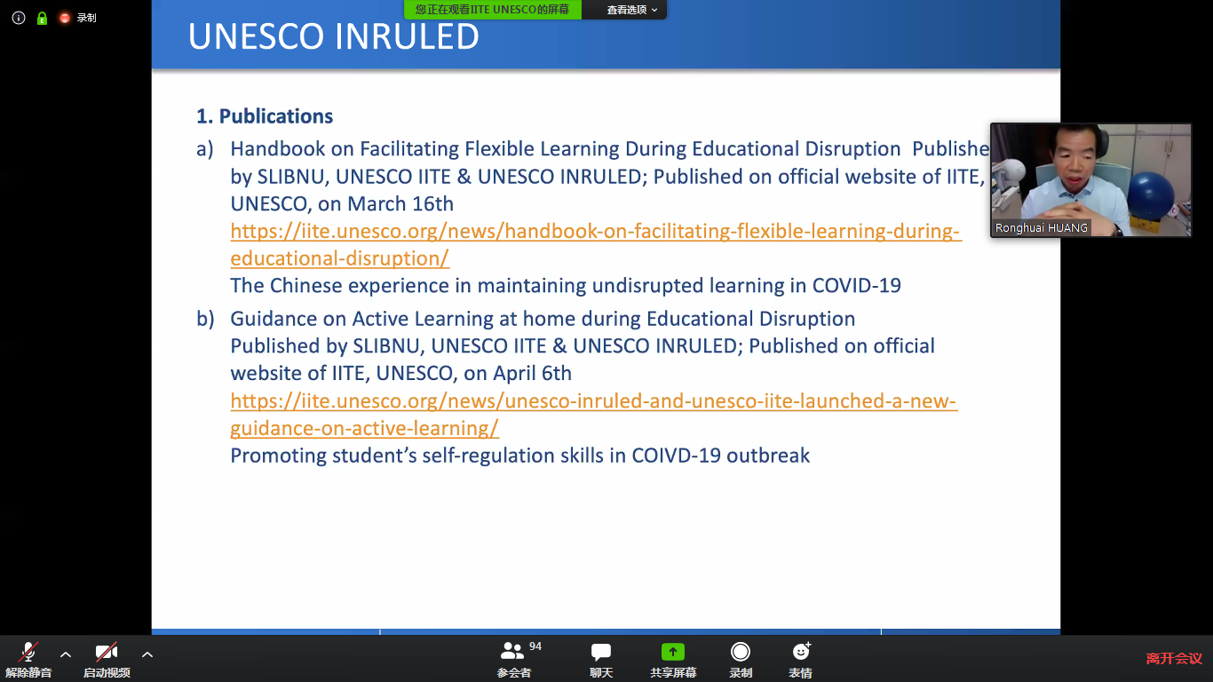 黄荣怀院长介绍了联合国教科文组织农教中心、教育信息技术研究所及北京师范大学智慧学习研究院分别于3月16日及4月6日联合发布的《弹性教学手册:中国“停课不停学”的经验》以及 《学校关闭期间学生居家主动学习指南: 如何提升自主学习技能》。