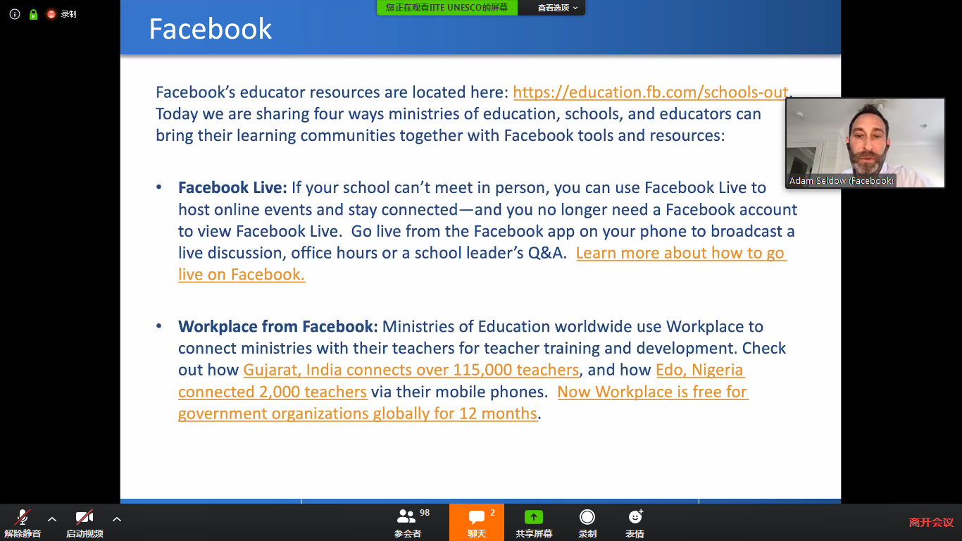 本次会议聚集了来自全球不同地区、不同时区的约100名在线参会者。Stefania Giannini 夫人和Firmin Matoko先生在致辞中,感谢在此次新冠肺炎疫情期间为非洲贡献力量的合作伙伴们。会议中,各参会者详细地介绍了针对教师信息化培训的各类方案,其中包括各类免费在线学习平台,整套教师培训课程,在线和移动学习资源,以及线下和电视及广播节目。