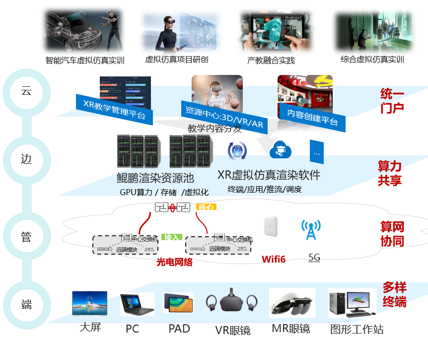 华为数字化实训方案支撑虚拟仿真教学常态化、规模化推广,实现“将虚拟仿真教学带入每一间教室”愿景。依托网联云控企业级架构,采用云-边-管-端分层协同部署方案,打破传统消费级功能教室的专用空间和设备限制,降低了虚拟仿真教学部署门槛。