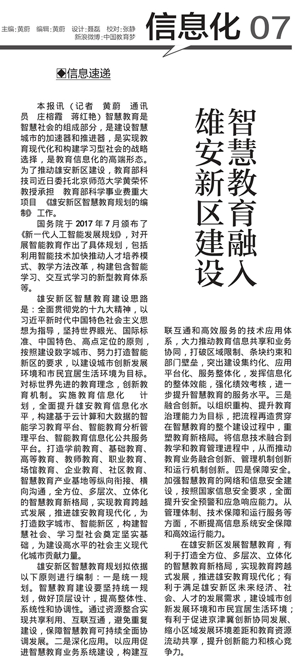 智慧教育是智慧社会的组成部分,是建设智慧城市的加速器和推进器,是实现教育现代化和构建学习型社会的战略选择,是教育信息化的高端形态。为了推动雄安新区建设,教育部科技司近日委托北京师范大学黄荣怀教授承担“教育部科学事业费重大项目”《雄安新区智慧教育规划的编制》工作。