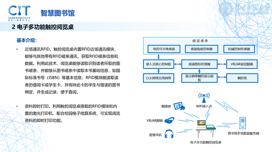 · 智慧图书馆:智慧图书馆智能接环系统、电子多功能触控阅览桌等